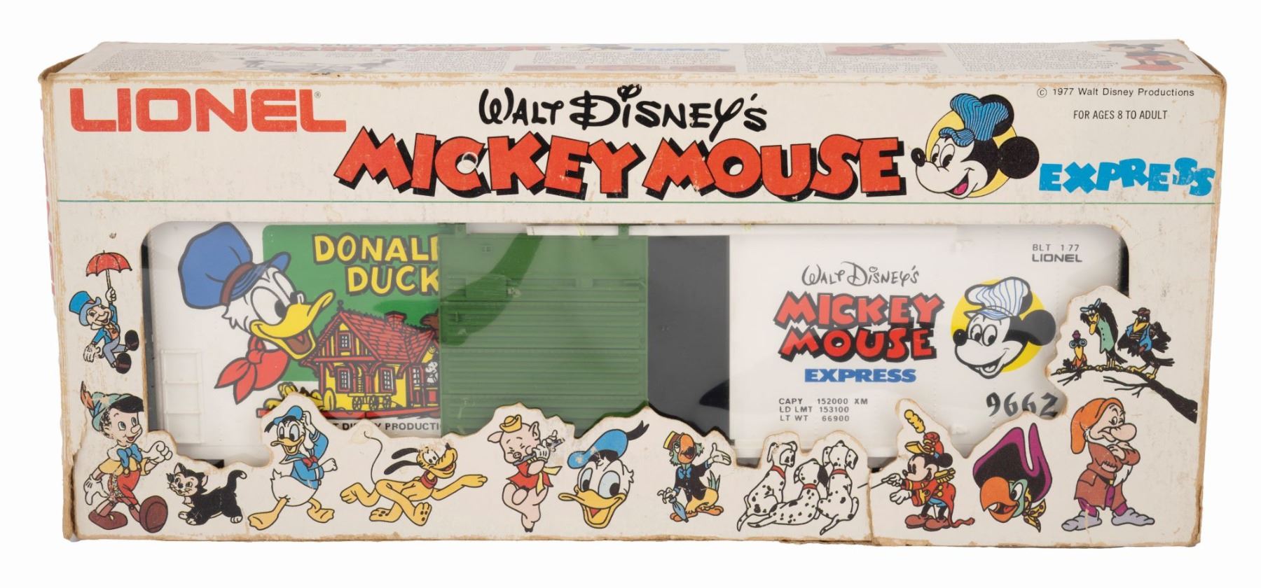 (Lionel, 1977) A Walt Disney's Express Donald Duck Hi Cube Box Car by Lionel. The commemorative toy celebrates the then 40-year partnership between Walt Disney and Joshua Lionel Cowen. Measuring 11.5" long, 4" tall, and 2.5" wide, the toy is in fine as-new condition within the original fair condition box, exhibiting tears and wear throughout but retaining all pieces.