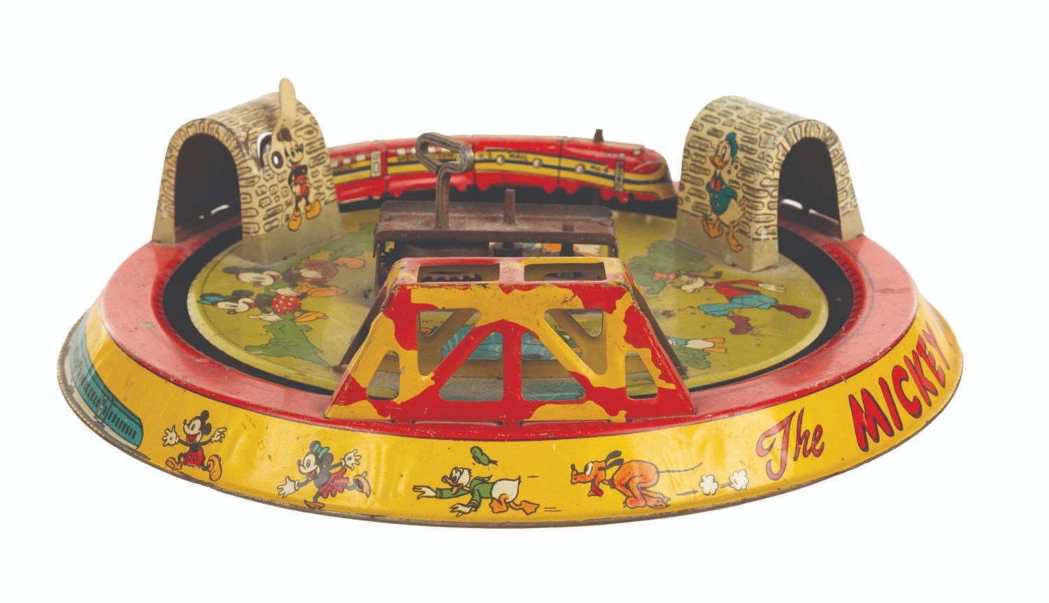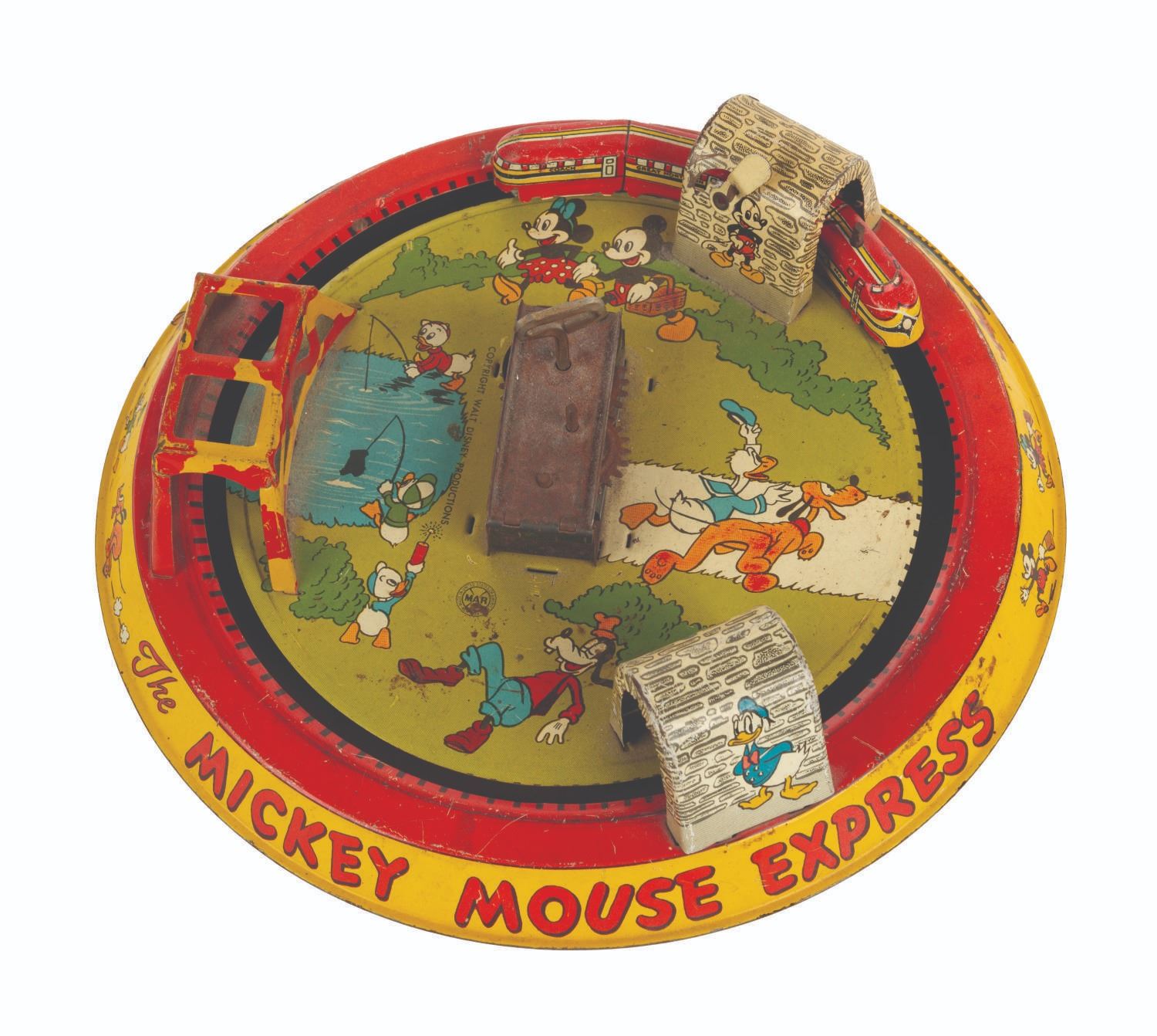 (Marx Toys, 1950s) A Mickey Mouse Express tin-litho train with spring wound action. Manufactured by Marx, the train figures are intended to circle the base when the integral winding key is turned. Measuring 9.5"x 2.25" tall, the toy is in fair condition, missing its central control cover and an arm with an airplane that would spin above. The mechanical parts are oxidized and do not function, but the toy displays nicely with a few chips, scuffs, and scratches.