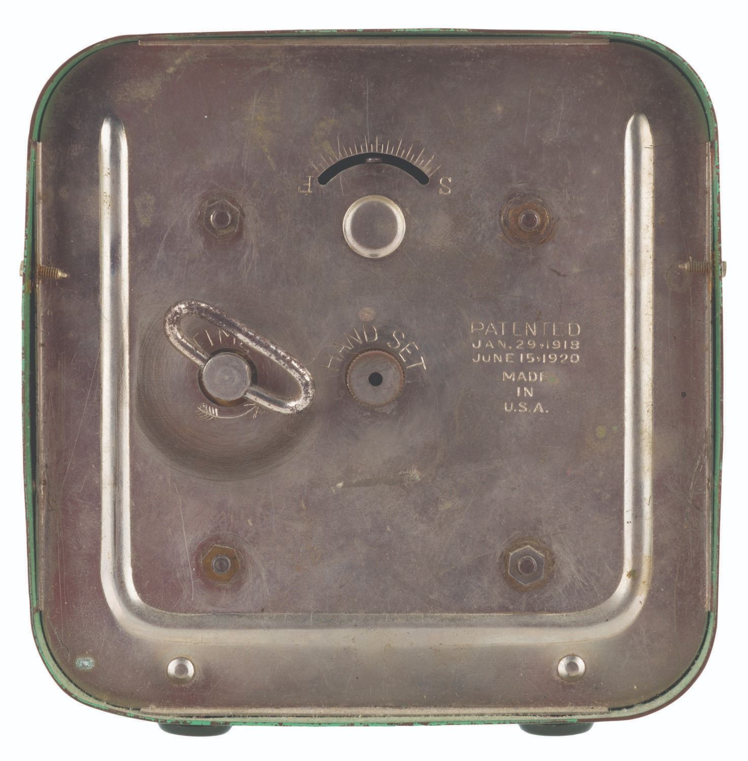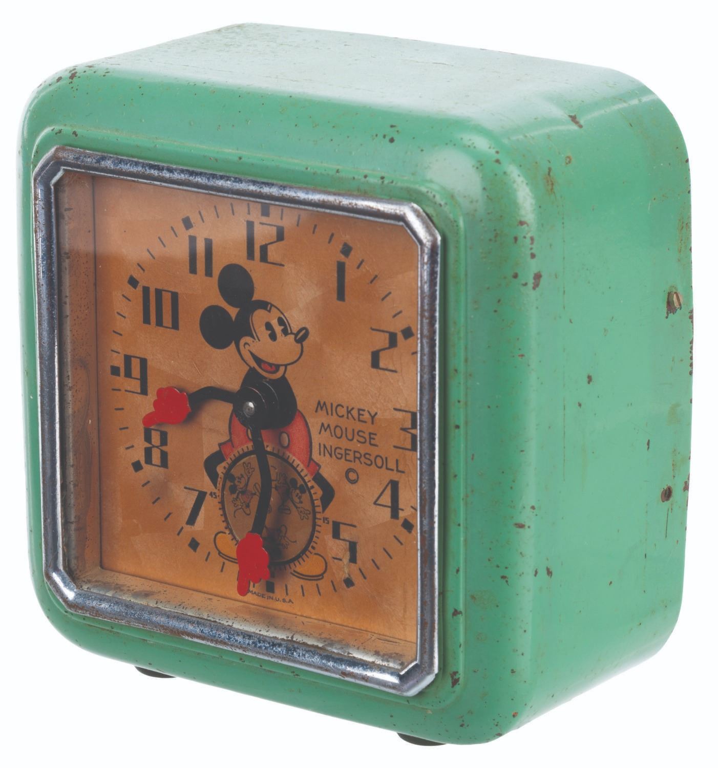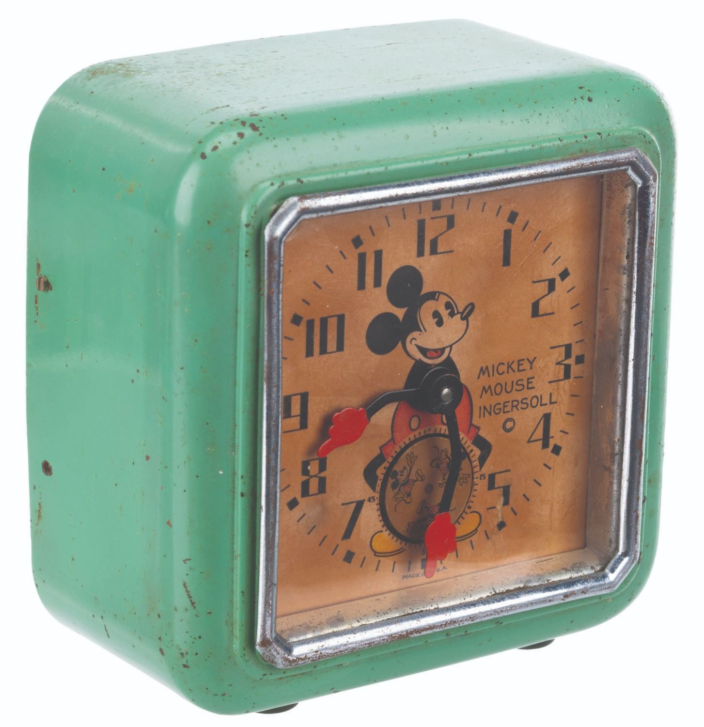 (Ingersoll, 1933) A metal case square Mickey Mouse wind-up clock by Ingersoll. The clock did not work when tested, likely requiring repair for proper functionality. Measuring 4.5" x 2.5" x 4.5", the clock is in good condition with discoloration from age, scuffs, oxidation, creases, and wear.