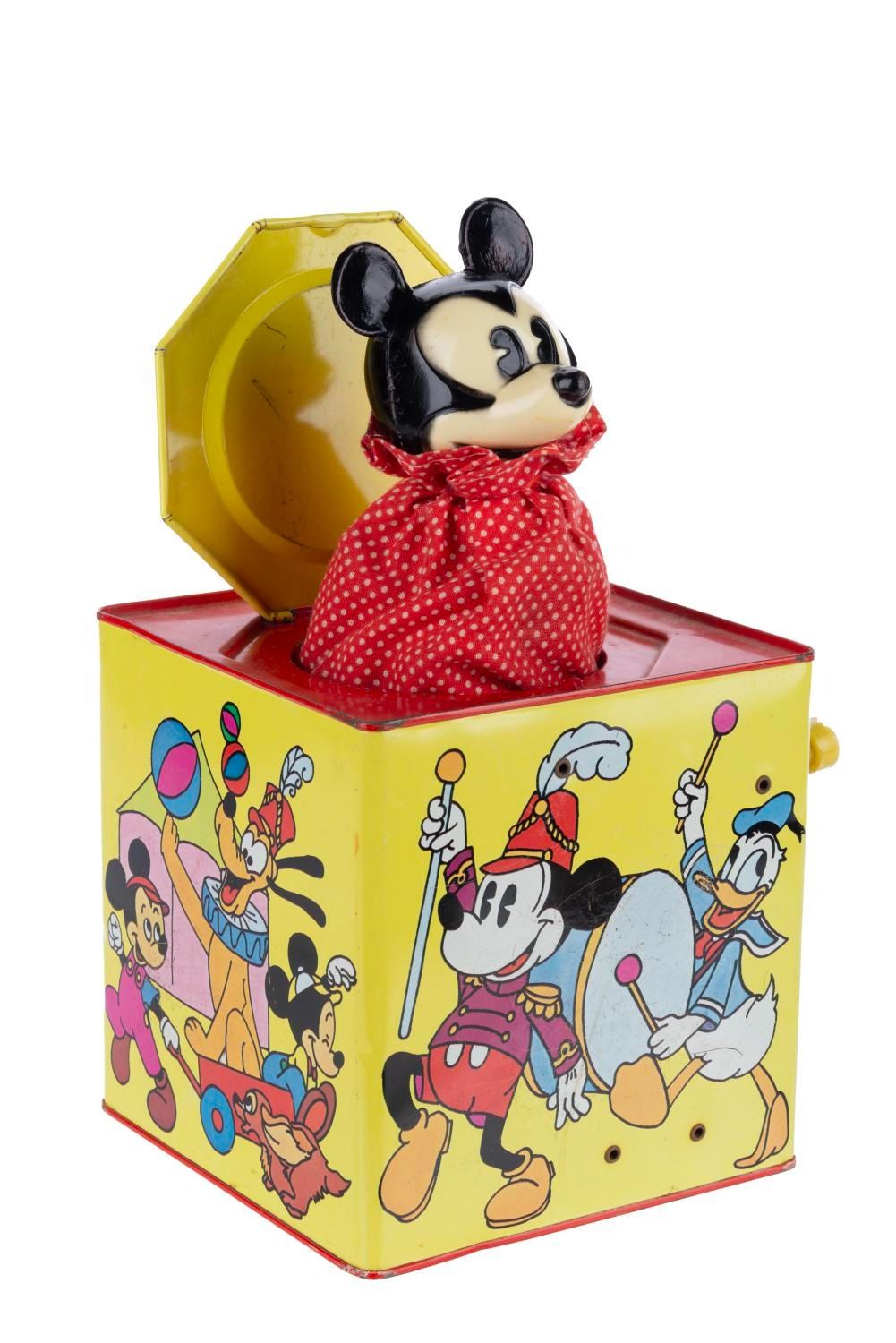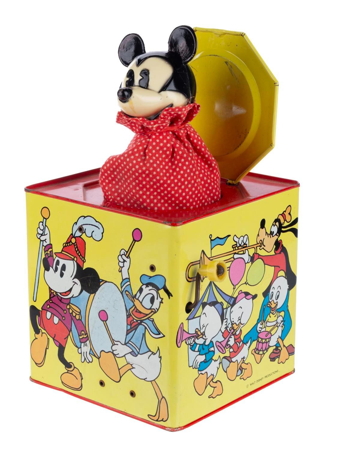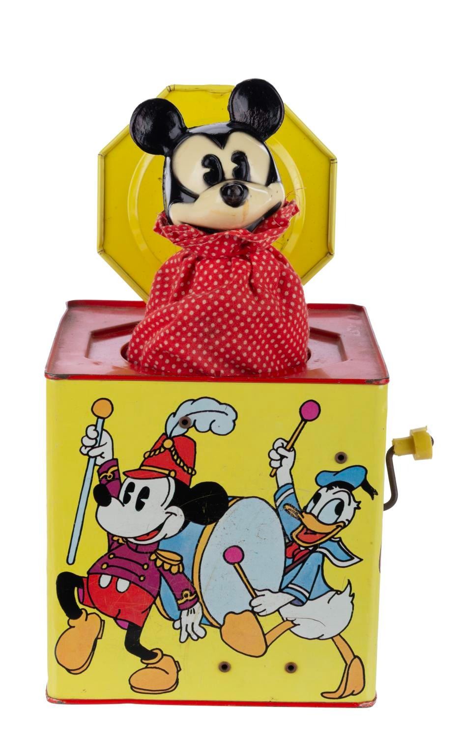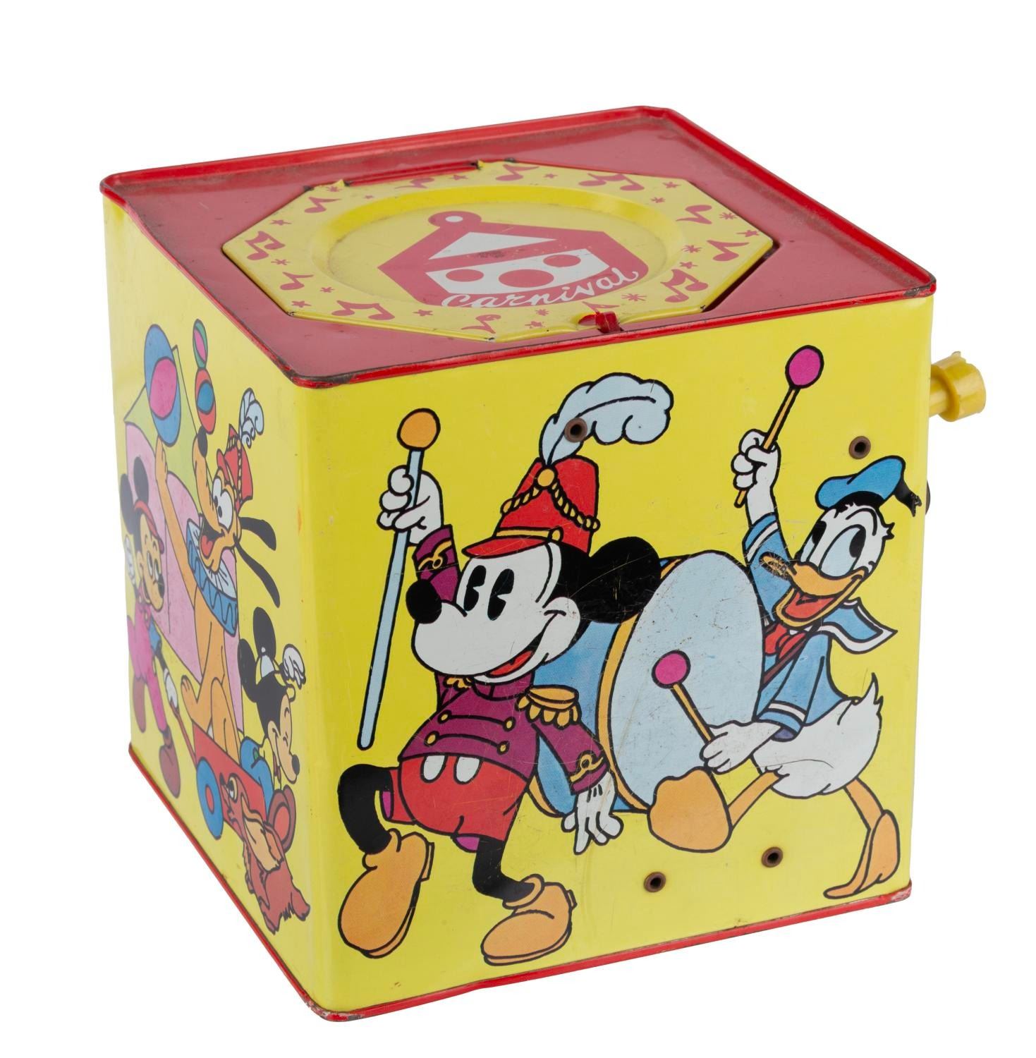 (Carnival, 1970s) A Mickey Mouse Jack-in-the-Box toy featuring Mickey Mouse, Morty, Donald, Goofy, and Lady. The crank is not functional and does not open the box, and the music feature does not play. Measuring 6.5"x5.75"x5.75" tall (when closed), this vintage toy displays in good condition, exhibiting scuffs and wear.
