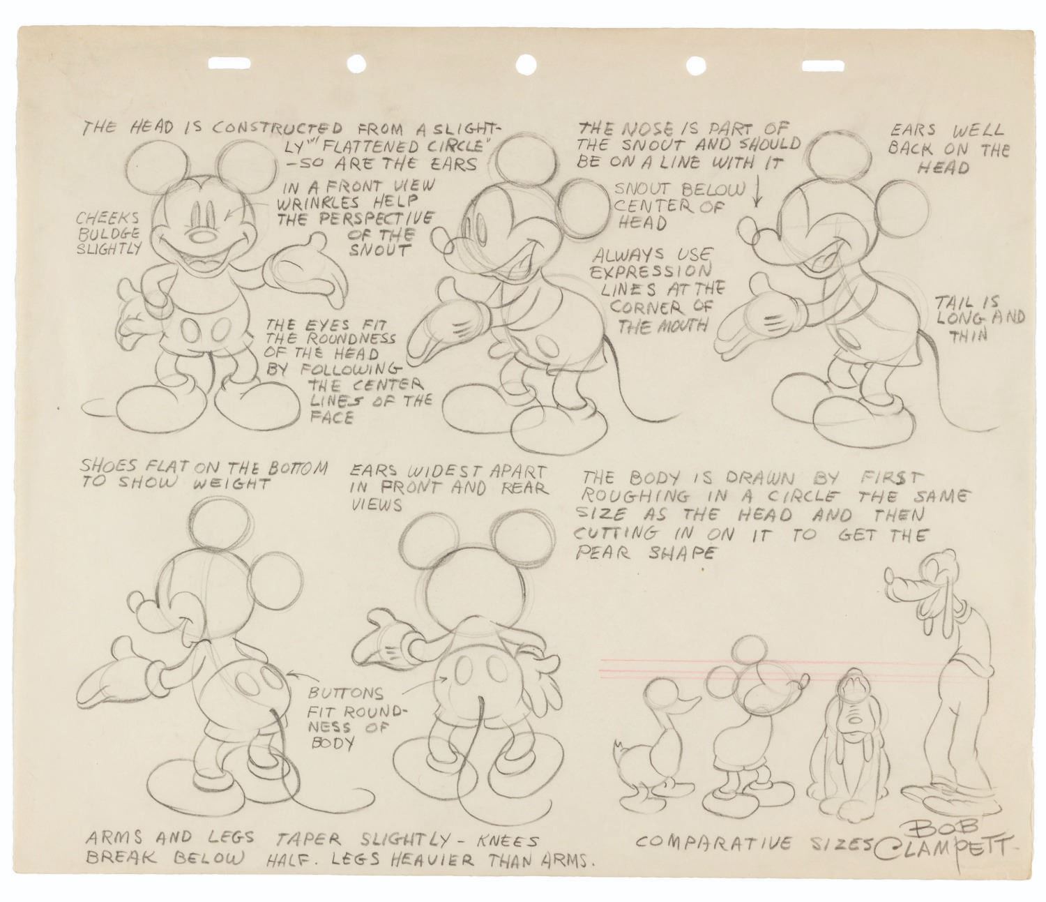 (Clampett, 1937-38) A Mickey Mouse model sheet hand drawn by Bob Clampett. This sheet very closely matches the official Disney Studio Mickey Mouse model sheet dated July 20, 1937, but signed by Bob Clampett instead of Disney artist Don Towsley. Accurately reproducing model sheets was, at the time, a standard exercise for animators applying to a Studio. Drawn on Disney animation paper, this sheet suggests Clampett may have been exploring the possibility of moving to Disney when he was hoping to start directing. Measuring 10” x 12”, the model sheet accomplished in graphite and red pencil is in very good condition, with light handling wear including a faint crease to the upper right corner.