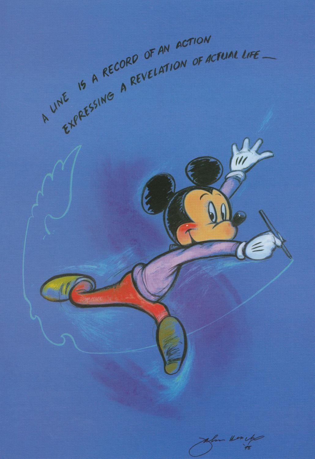 (WDI, 1998) An original motivational print featuring Mickey Mouse explaining that "A line is a record of an action expressing a revelation of actual life." The print was designed by Disney Legend John Hench, an Imagineer, Animator, and the Official Corporate Portrait Artist of Mickey. A facsimile Hench signature dated '98 is on the bottom right edge. Measuring 8.5” x 11”, the print is in very good condition with minimal edge and corner wear.