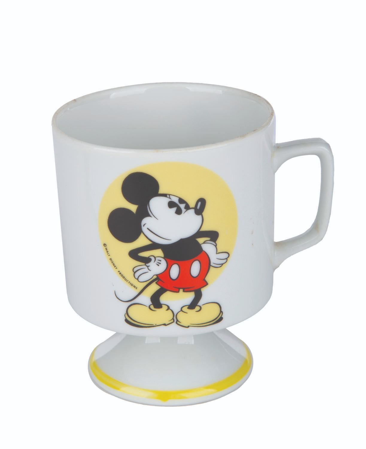 (Disney, 1970s) A Mickey Mouse mug with the retro "pie-eyed" style popularized in the 1970s. Standing 4" tall the mug is in very good condition with two short hairline cracks near the handle in the outer glaze only.