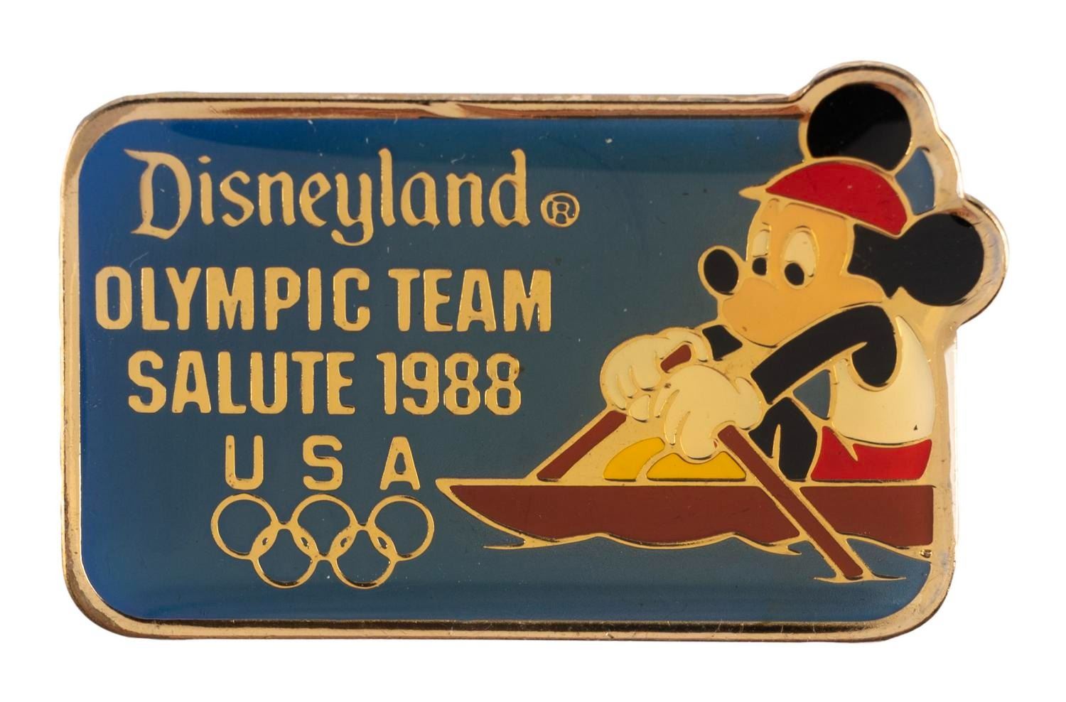 (Disneyland, 1988) A Disneyland Olympic Team Salute 1988 pin featuring Mickey Mouse rowing. Measuring 1.25" wide, the pin is in very good condition with slight color shift from age.