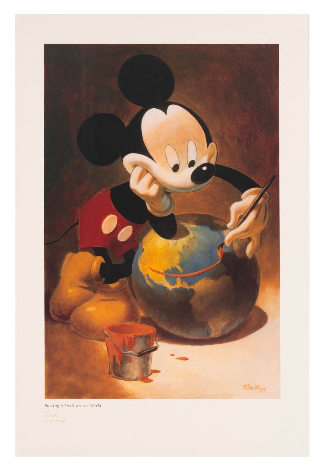 (Disney, 2008) A Mickey Mouse “Putting a Smile on the World” print by Paul Felix, released at D23 in 2008. The print measures 20” x 30” overall, with an image sie of 16” x 24” and is in very good condition with light edge wear.