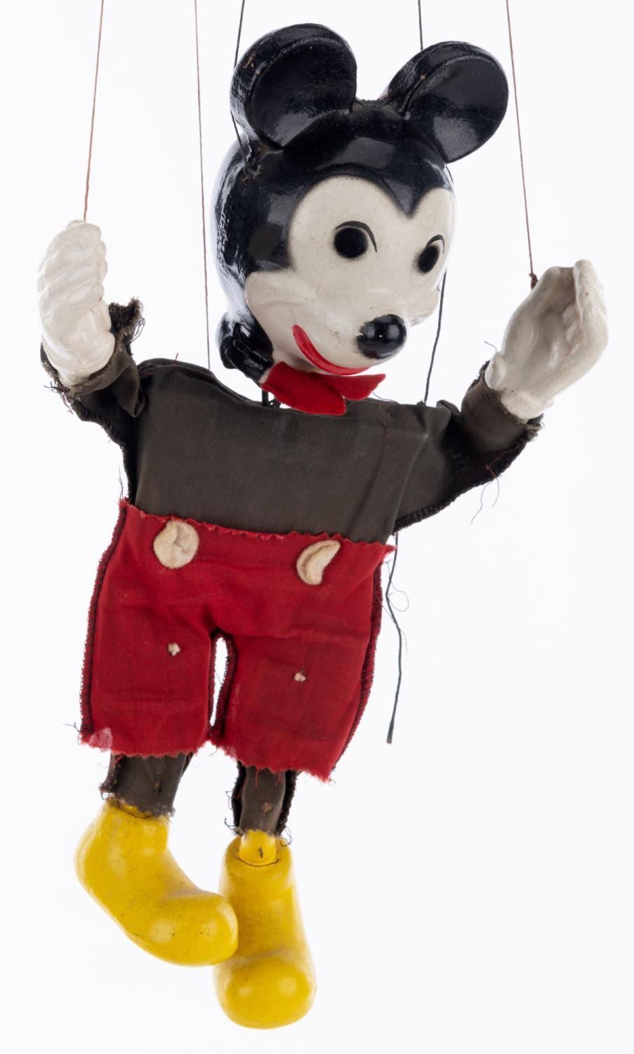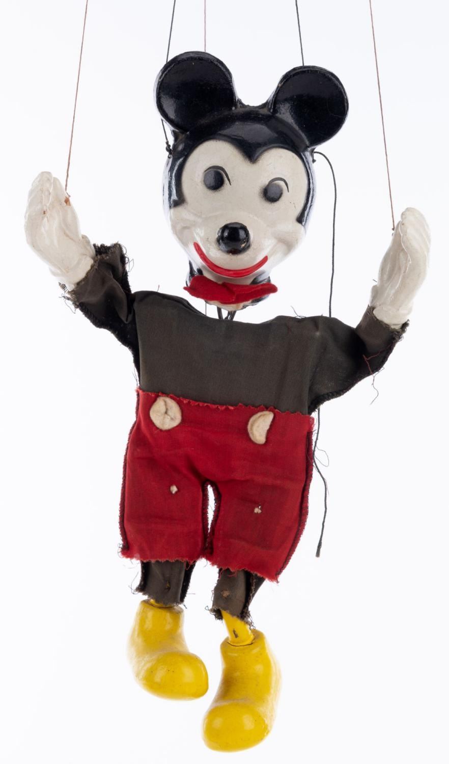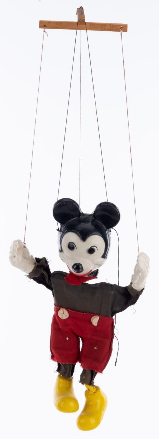 (Peter Puppet Playthings, 1950s) A marionette puppet of Mickey Mouse, manufactured in the 1950s by Peter Puppet Playthings, with hand-detailed fabric clothing. Measuring 5" x 4" and 12" in length (not including the strings and controller), the puppet is in fair condition with overall fading and discoloration, cracks to the left side of Mickey's head and hands, paint wear, and scuffs.