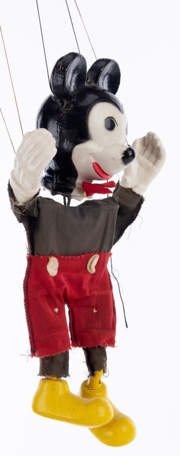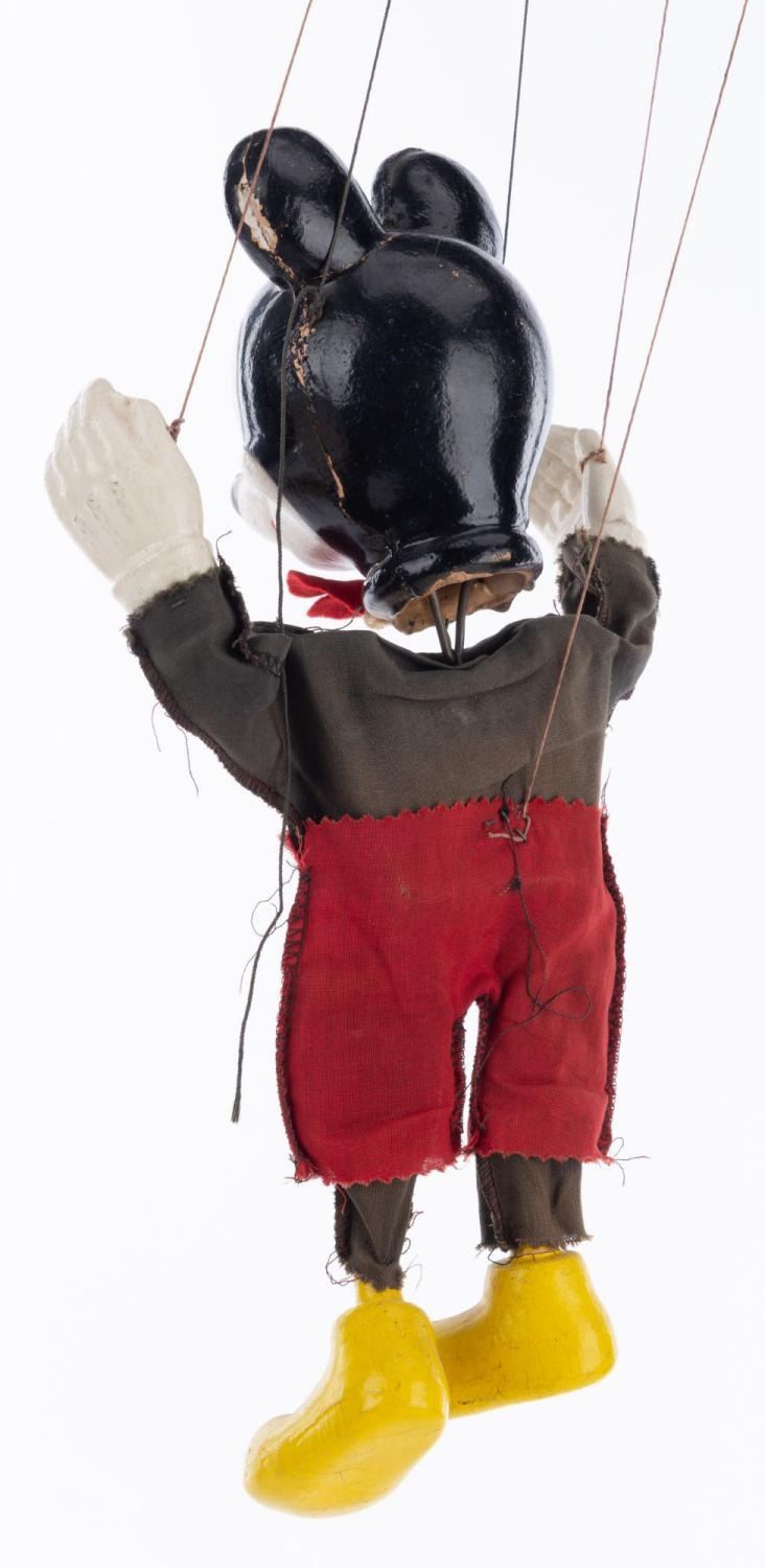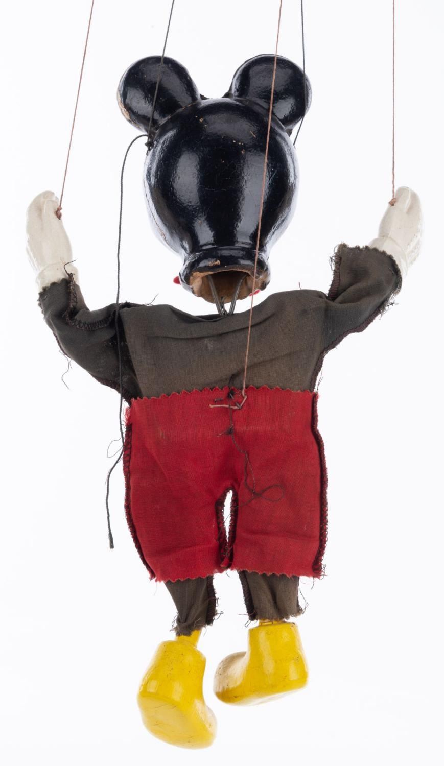 (Peter Puppet Playthings, 1950s) A marionette puppet of Mickey Mouse, manufactured in the 1950s by Peter Puppet Playthings, with hand-detailed fabric clothing. Measuring 5" x 4" and 12" in length (not including the strings and controller), the puppet is in fair condition with overall fading and discoloration, cracks to the left side of Mickey's head and hands, paint wear, and scuffs.