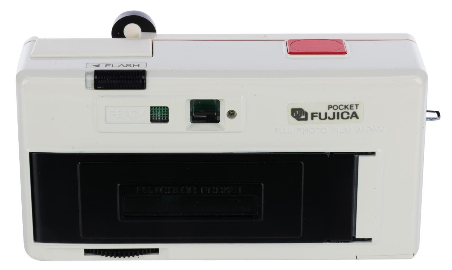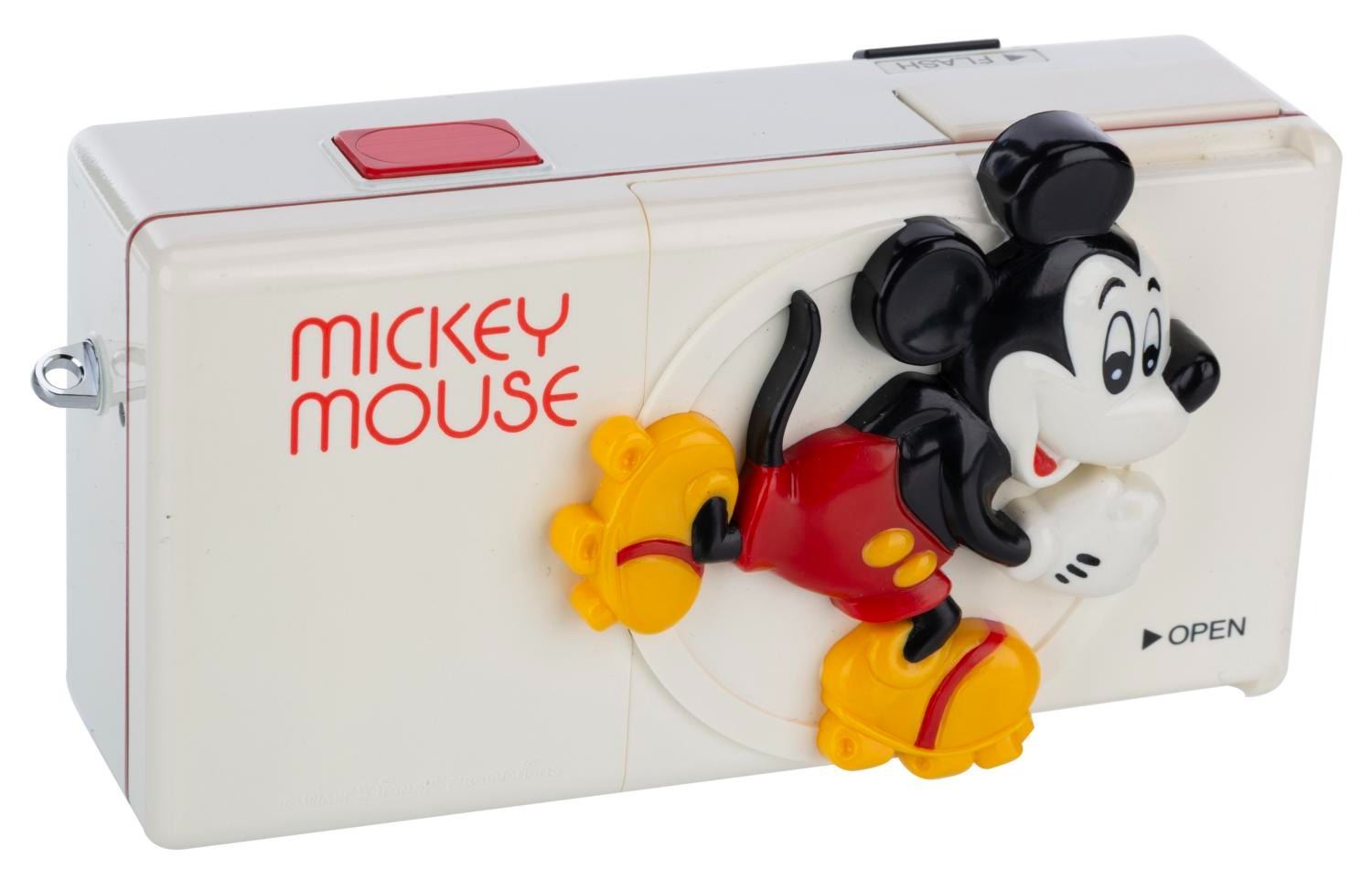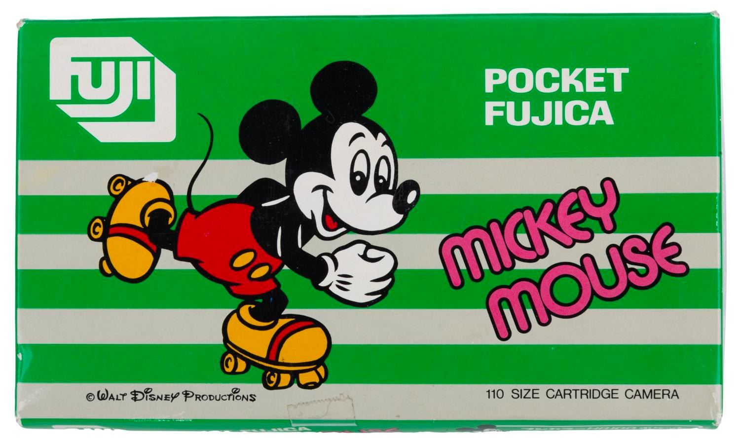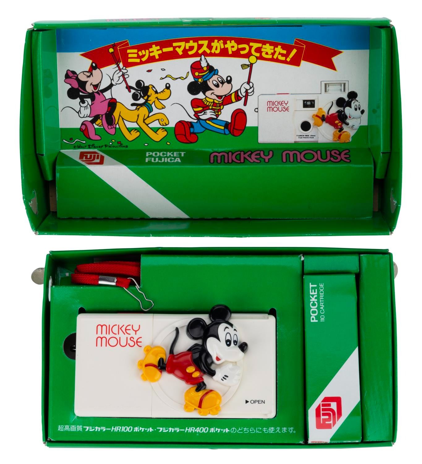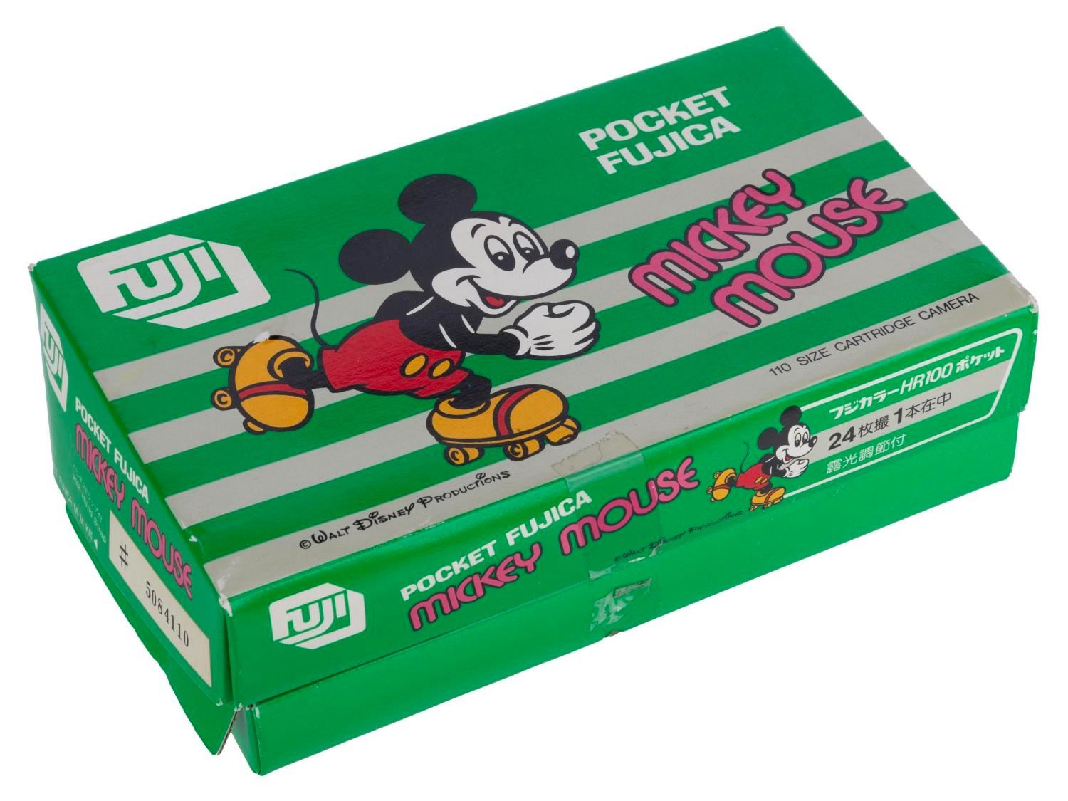(Fujica, 1983) A rare Mickey Mouse Pocket Fujica camera in its original box. The camera includes unopened 110-format film, two unopened National Hi-Top AA batteries, and a camera strap. Measuring 2.25" x 4.5, the camera is in fine condition. Its 2" x 4.5" x 8" original box is in good condition with a small rip, light scratches, tape residue, and writing on the back.