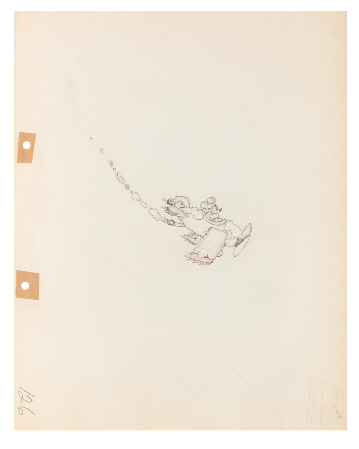 (Disney, 1933) An original production drawing of Mickey Mouse from the short “The Mail Pilot.” With a character image size of 4” x 5” on 9.5” x 12” animation paper, the graphite and colored pencil drawing is in very good condition with light creases and discoloration from age.