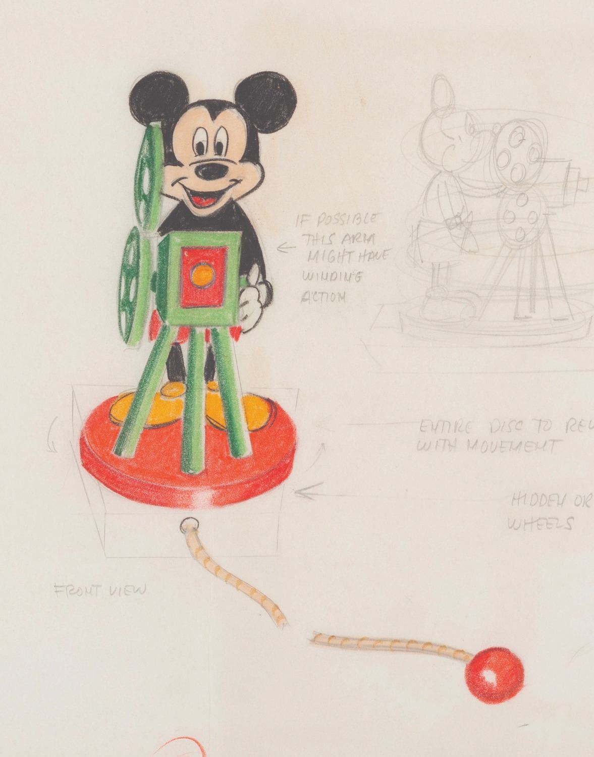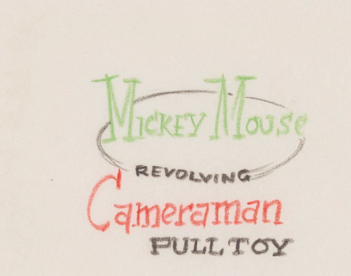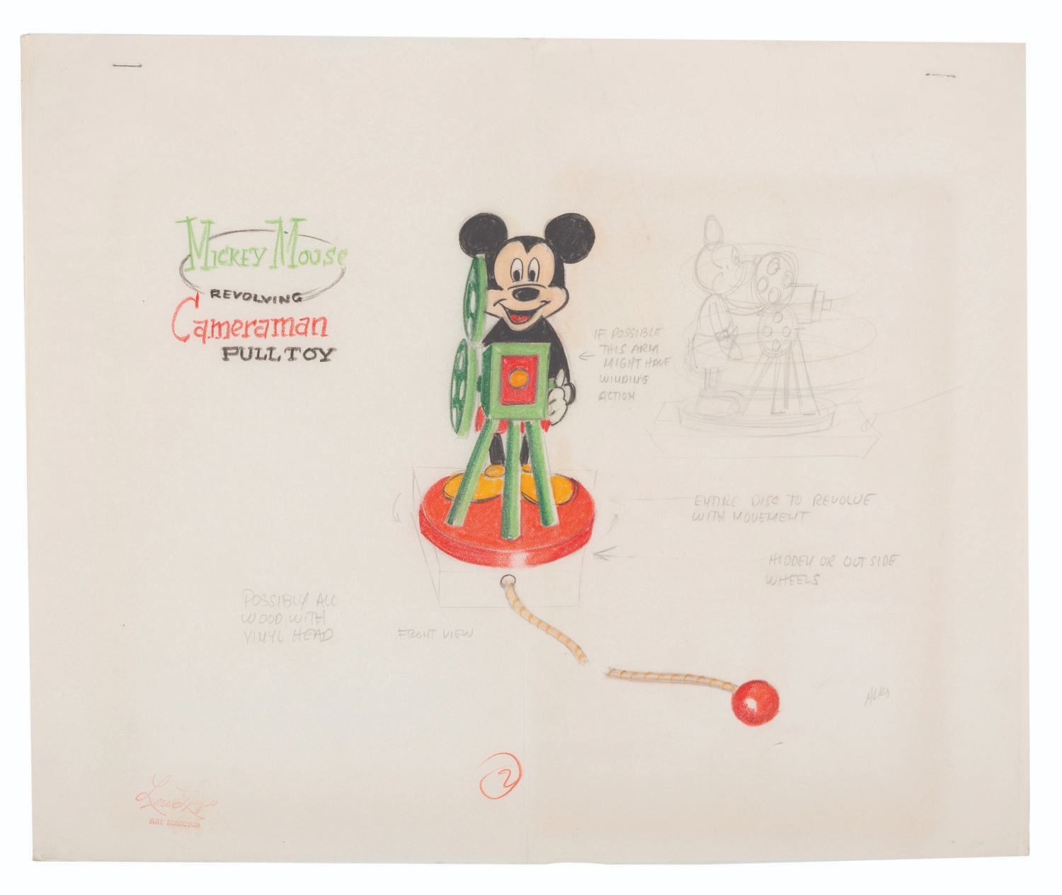 (Strombecker, 1950s) An original Lou Lispi concept drawing for a Mickey Mouse Revolving Cameraman Pull toy for Strombecker. Lispi became the Art Director of Walt Disney Productions Character Merchandise Division starting in 1932 and bears his stamp at the lower left corner of the drawing. Measuring 14” x 17” with an image size of 9” x 12”, the crayon and graphite on tracing paper drawing displays in good condition with light edge wear and creasing, a vertical center fold, and light discoloration from age. The drawing is stapled to a thicker opaque paper along the top edge.