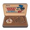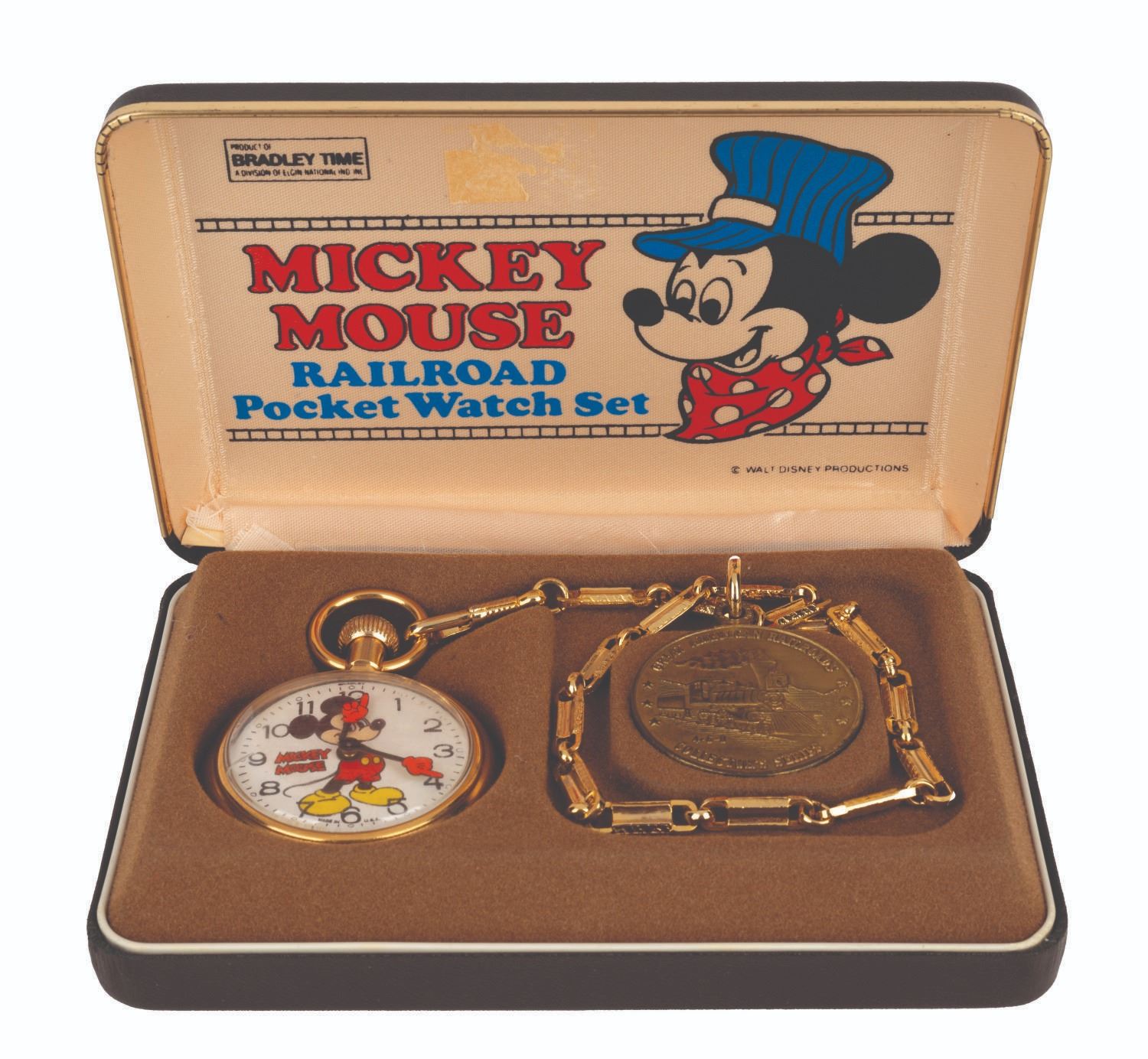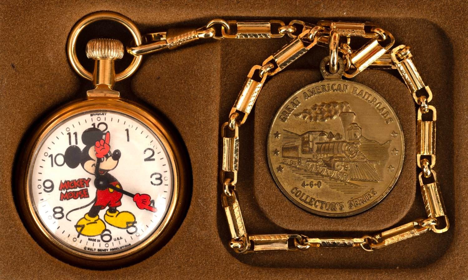 (Bradley, 1970s) A Great American Railroads Collectors Series Mickey Mouse Railroad pocket watch set by Bradley Time. The timepiece measures 2" in diameter on a 13" long chain, features a 1.5" diameter commemorative medallion, and is accompanied by its 6"x4"x1.25" jewelry case box. The watch is not in working order and requires servicing. The set displays in very good condition exhibiting scuffs and light wear to the watch and box.