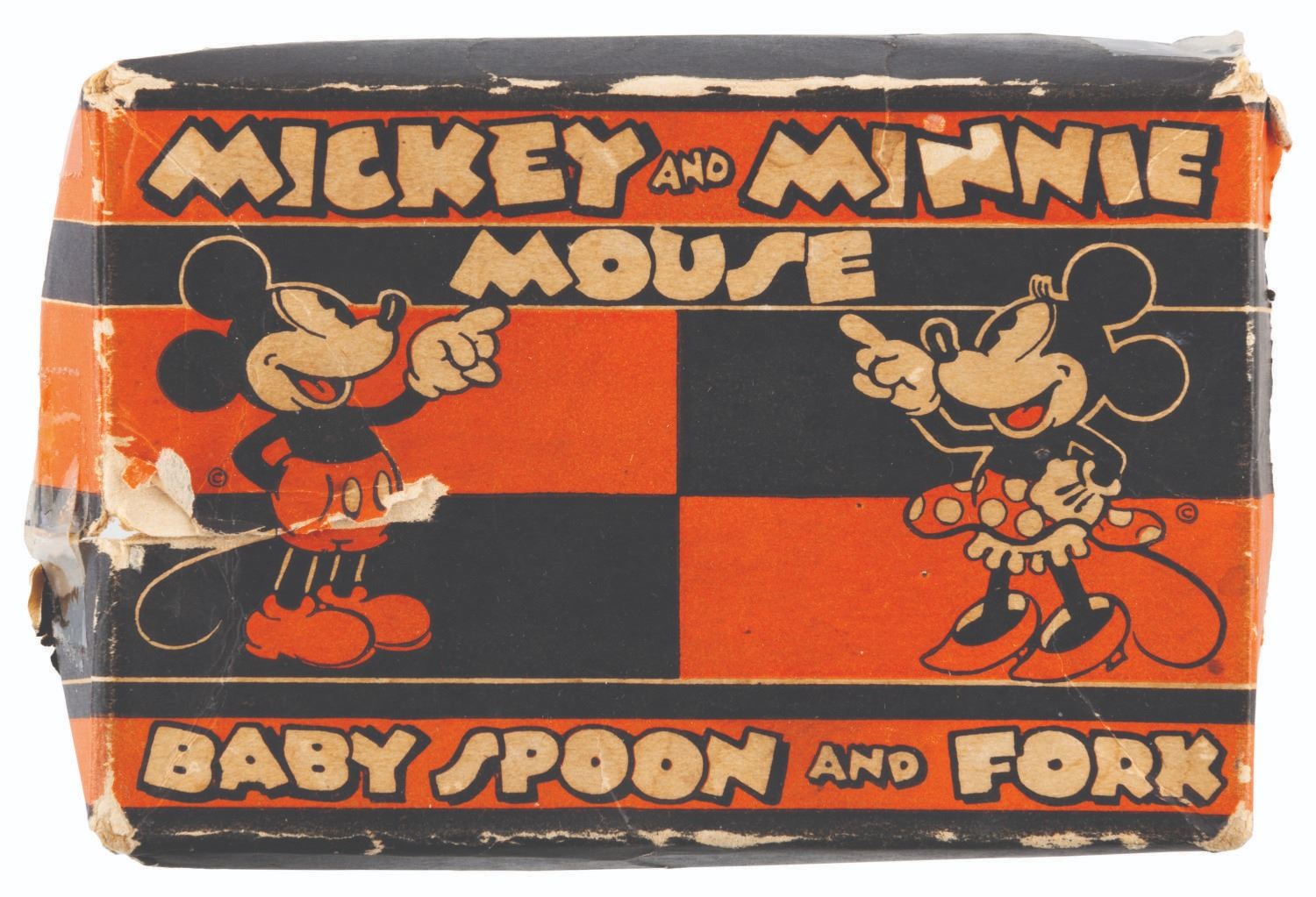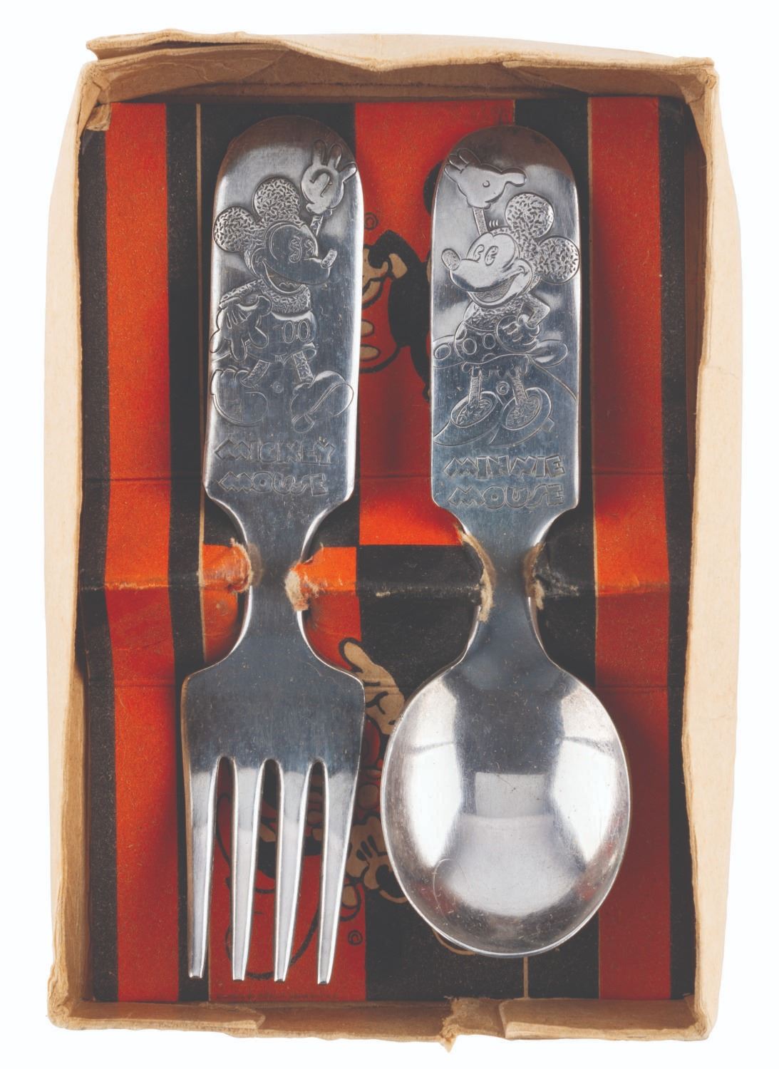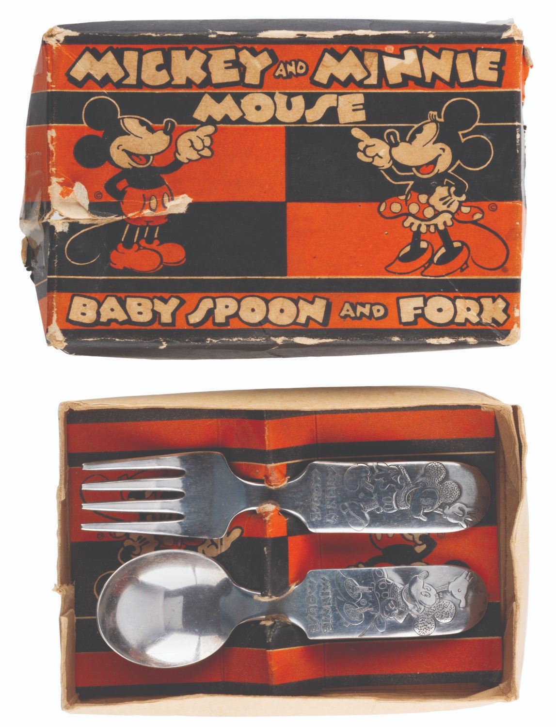 (Fairfield Silverplate, 1930s) A silver-plated Mickey and Minnie Mouse Baby Spoon and Fork set in the original box. The fork features an engraving of Mickey, while the spoon is engraved with Minnie. Measuring 1.25" x 4" to 1" x 4.25" in the 3" x 4.75" box, the set is in good condition with light scuffing, while the box is in fair condition with heavy crushing, tears, adhesive tape repairs, paper loss, discoloration, and stains.