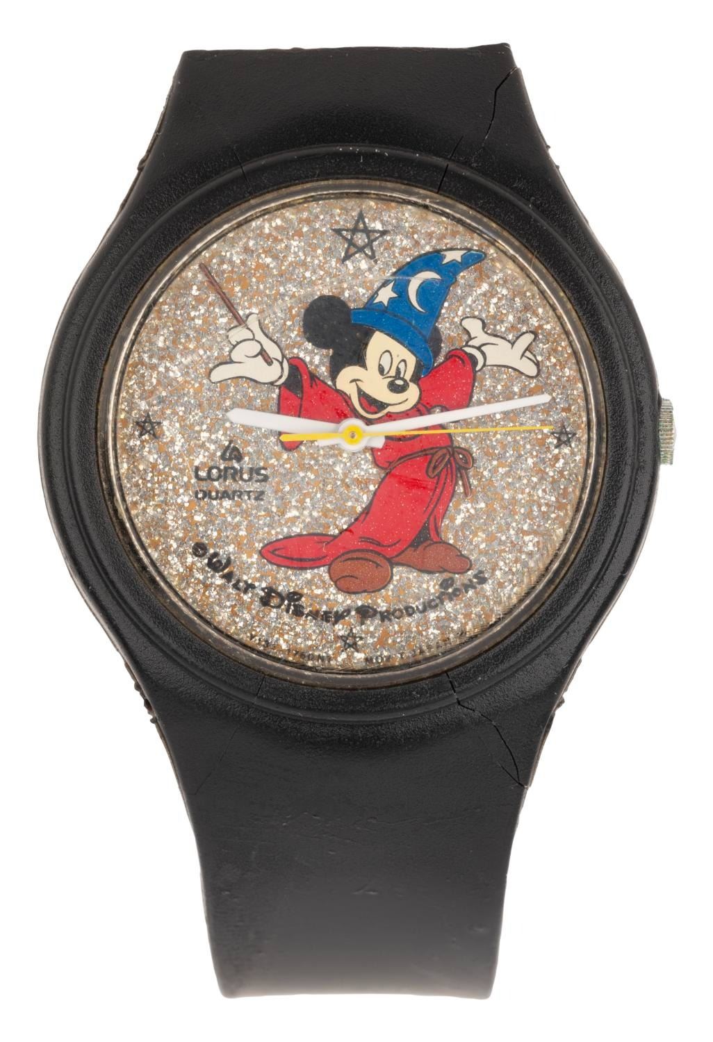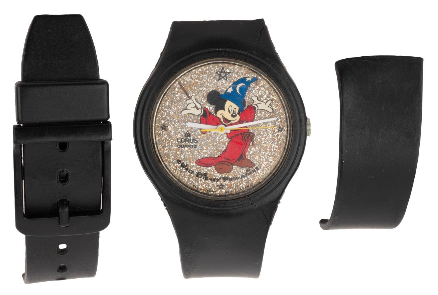 (Disney, 1980s) A Mickey Mouse as the Sorcerer’s Apprentice wristwatch. The function of the watch has not been tested and may require service. With a 1.25 diameter face, the watch is in fair condition, requiring a replacement band, due to the cracking of its band from age.