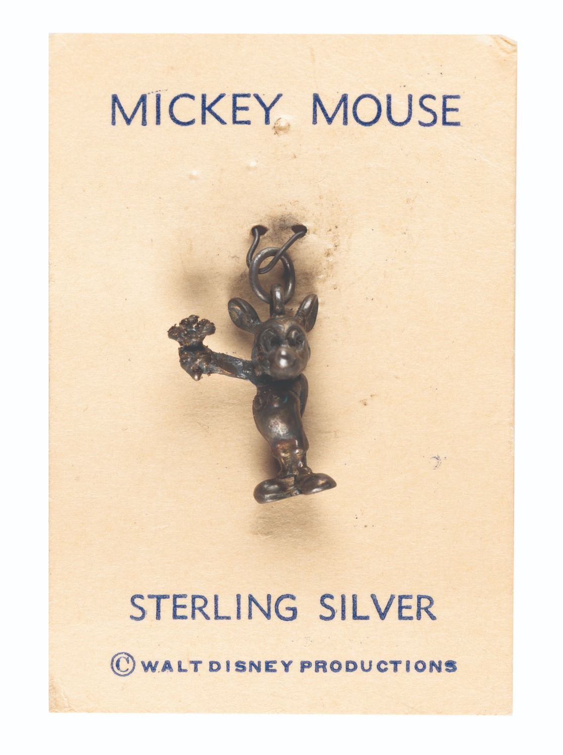 (Delta, 1940s-50s) A sterling silver charm of Mickey Mouse, manufactured by Delta of Hollywood, and attached to its original backing card. Measuring 0.5” x 1”, the charm displays in very good condition with light wear and oxidation from age, while the 1.5” x 2.25” card is in good condition with pinholes, scratches, creases, and wear.