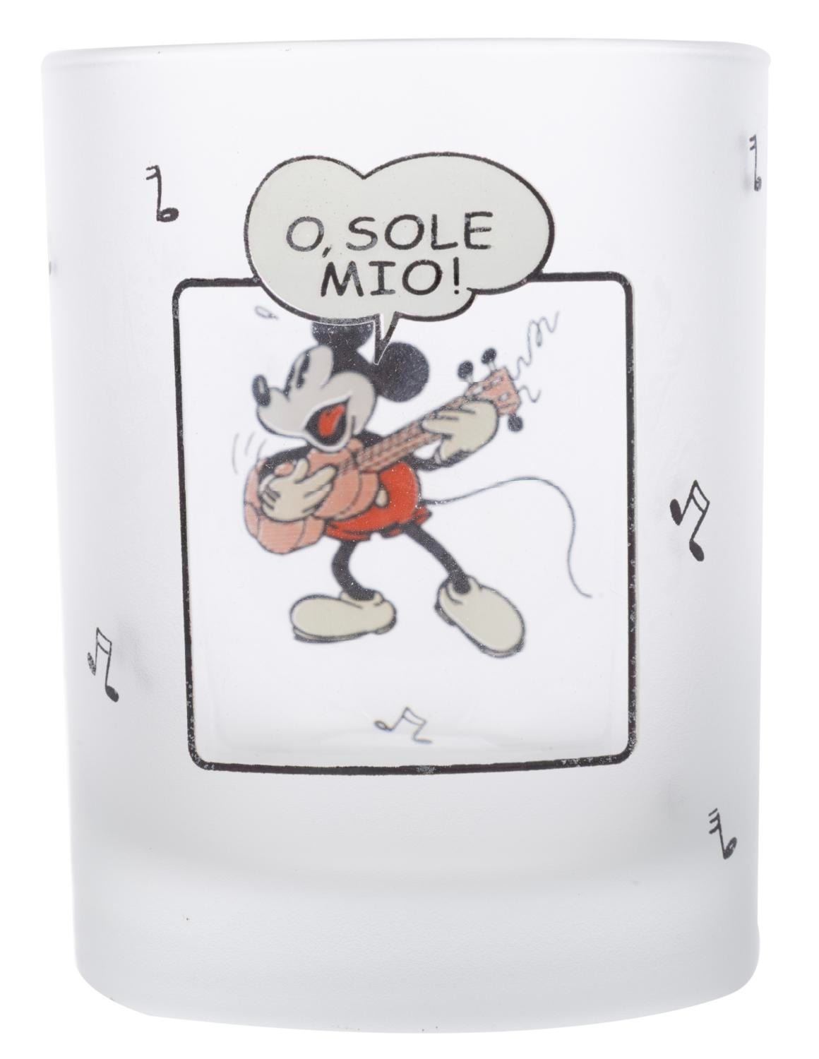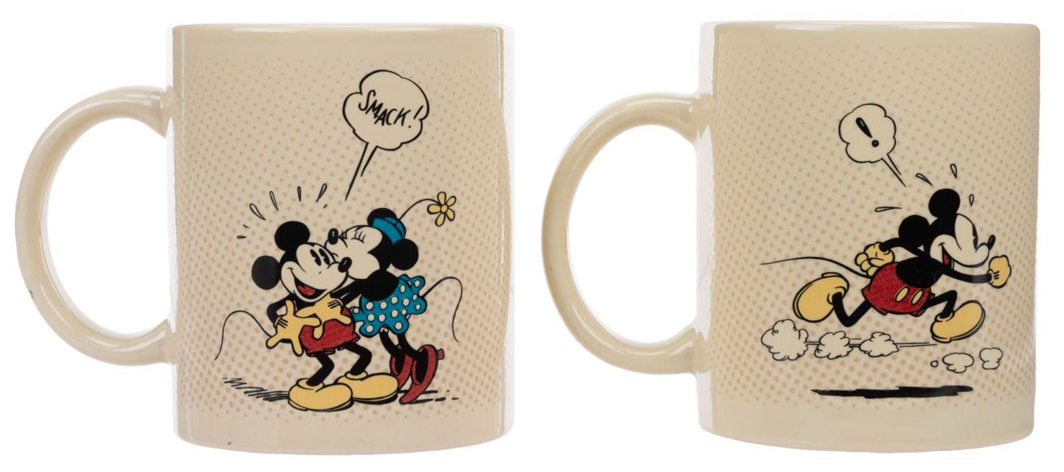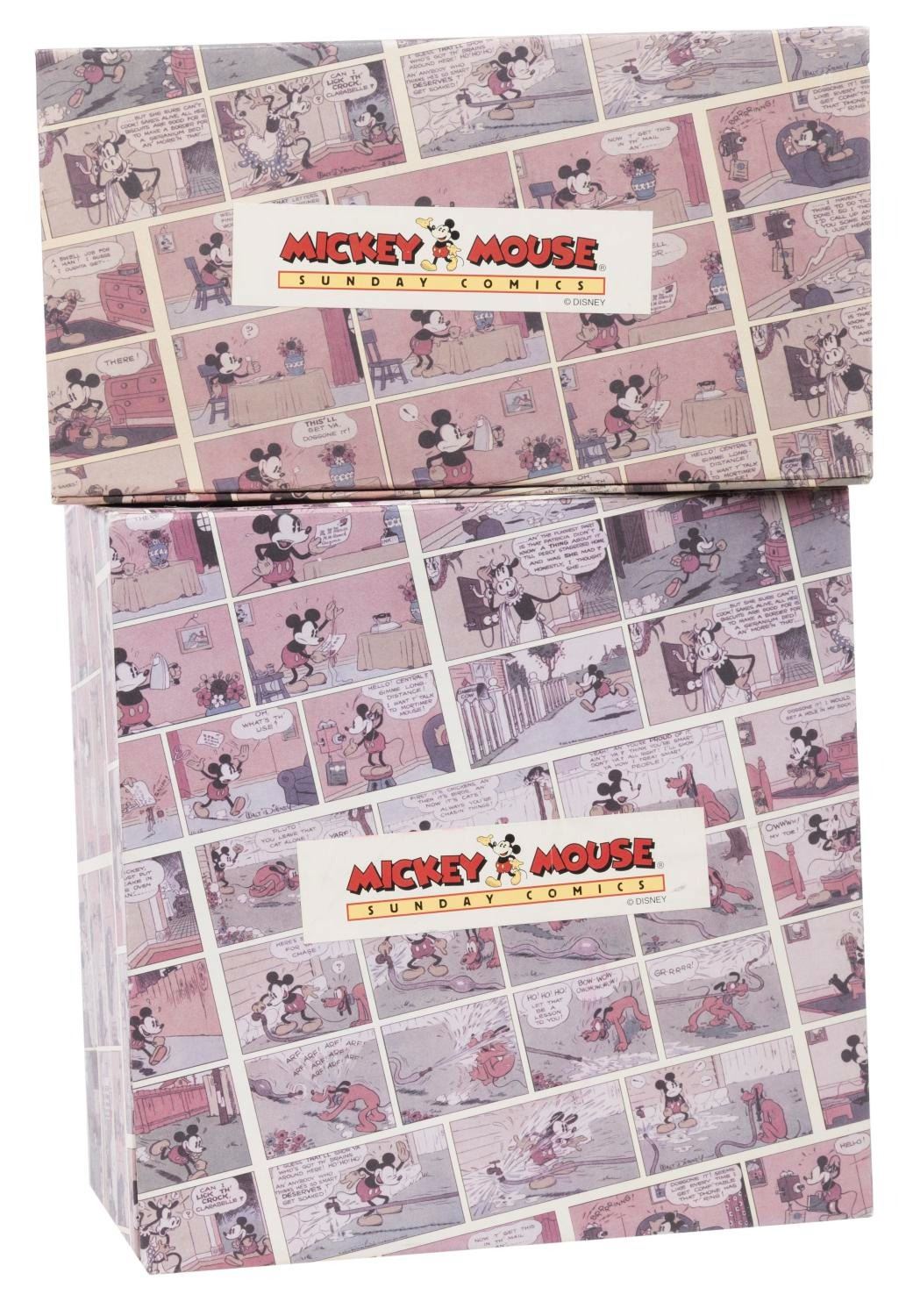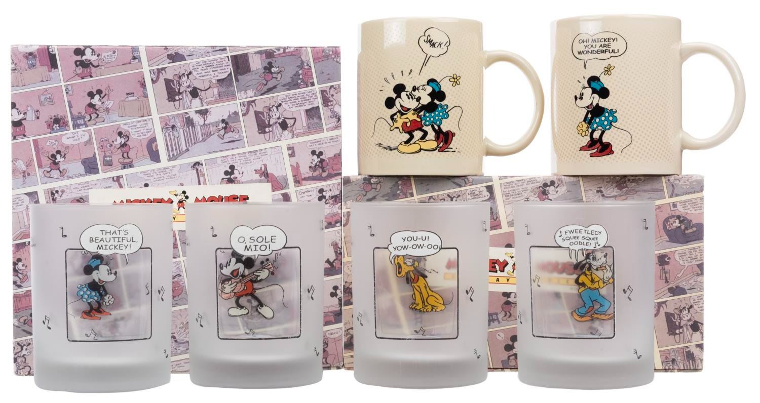 (Disney, 1990s) A set of glassware from the Mickey Mouse Sunday Comics collection. Included are two ceramic coffee mugs and four frosted drinking glasses featuring Mickey and Friends as seen in the classic Sunday Comics. Measuring 3.25" x 3.25" x 4" tall to 3.25" x 4.75" x 3.25" tall, the glassware is in good condition in the original retail packaging with wear to the paint from age. The packaging exhibits fading, edge wear, and spots of paper loss.