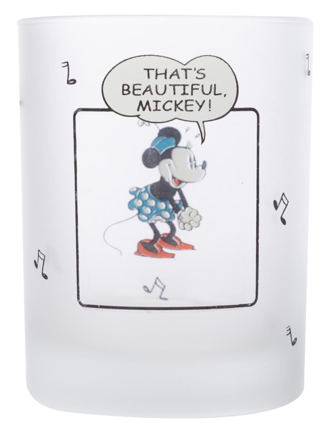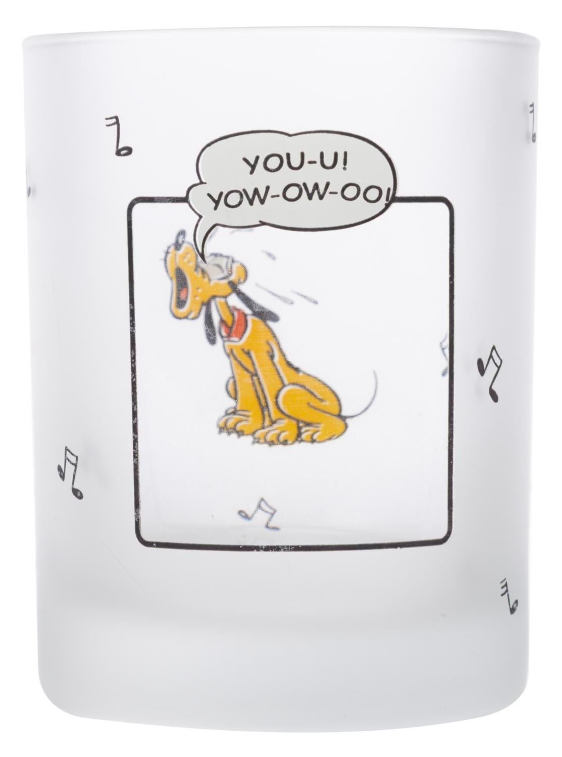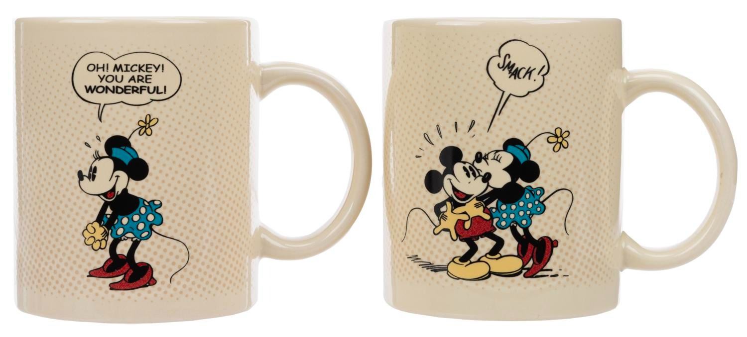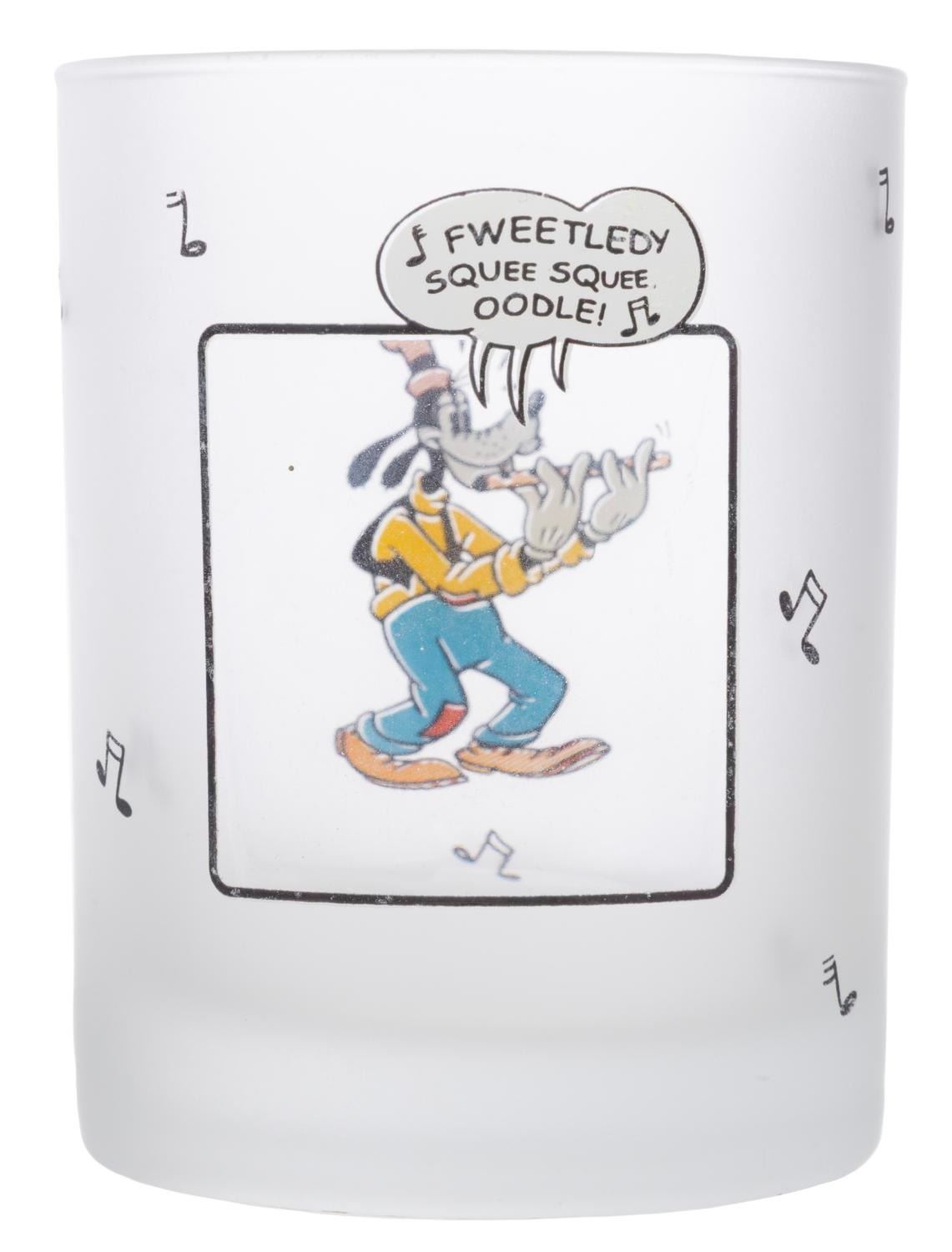 (Disney, 1990s) A set of glassware from the Mickey Mouse Sunday Comics collection. Included are two ceramic coffee mugs and four frosted drinking glasses featuring Mickey and Friends as seen in the classic Sunday Comics. Measuring 3.25" x 3.25" x 4" tall to 3.25" x 4.75" x 3.25" tall, the glassware is in good condition in the original retail packaging with wear to the paint from age. The packaging exhibits fading, edge wear, and spots of paper loss.