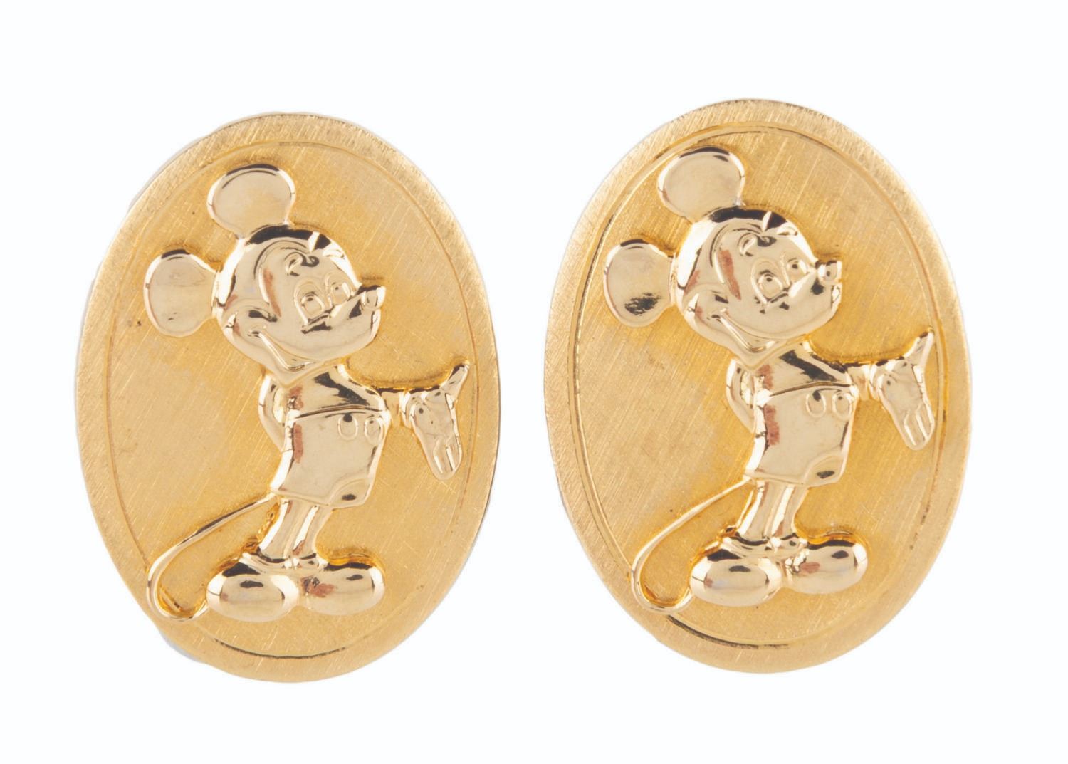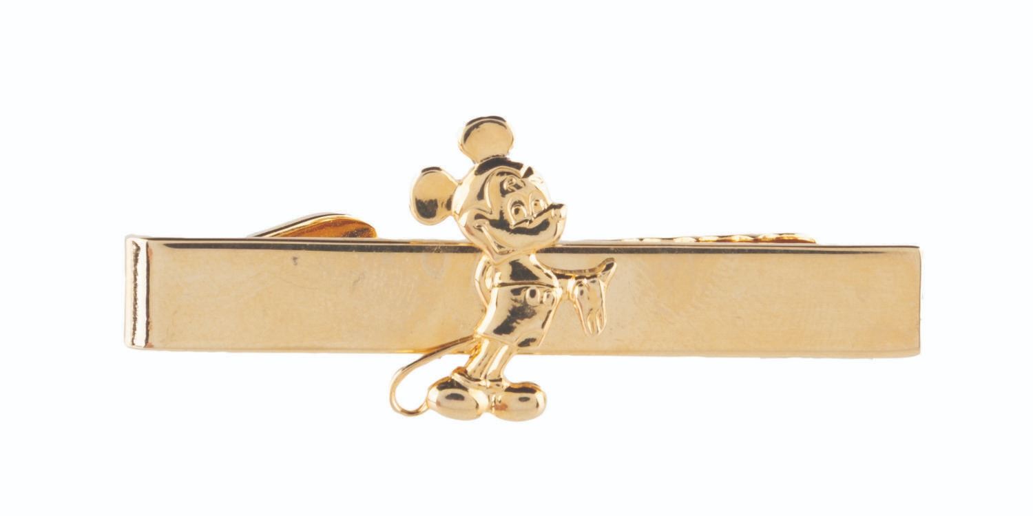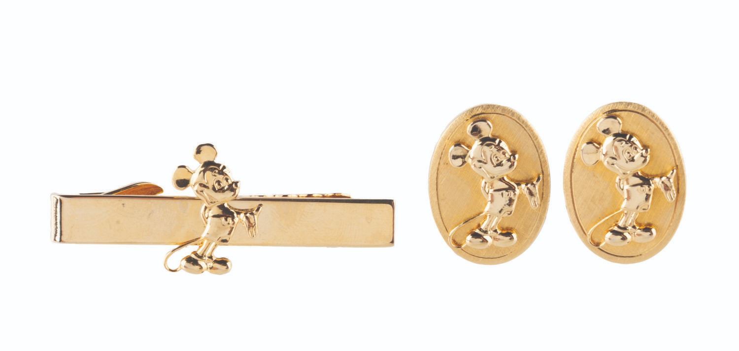 (Disney, 1980s-90s) A pair of gold-toned Mickey Mouse cufflinks and a tie clip. Measuring 0.75 " x 1 " to 1 " x 2 ", the set is in very good condition with minimal wear.