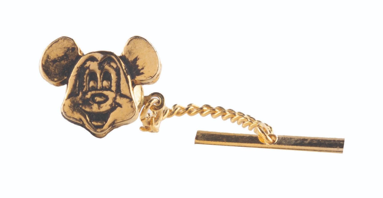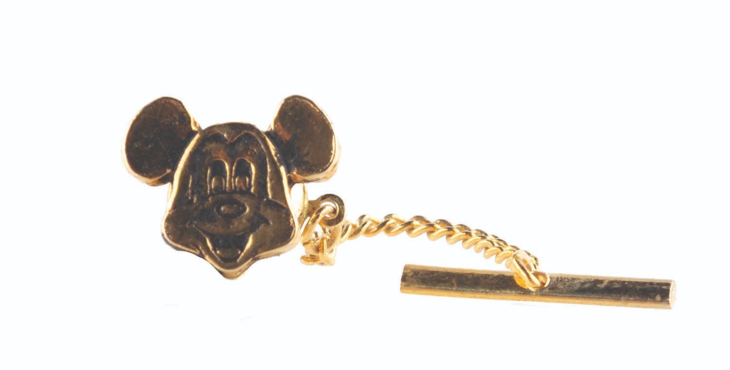 (Disney, 1970s-80s) A tie tack in the shape of Mickey Mouse's head. Measuring 0.75 ", the tie tack is in fair condition with discoloration and oxidation from age.