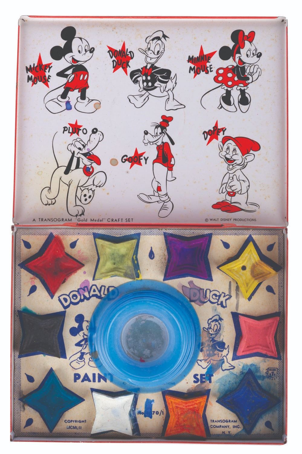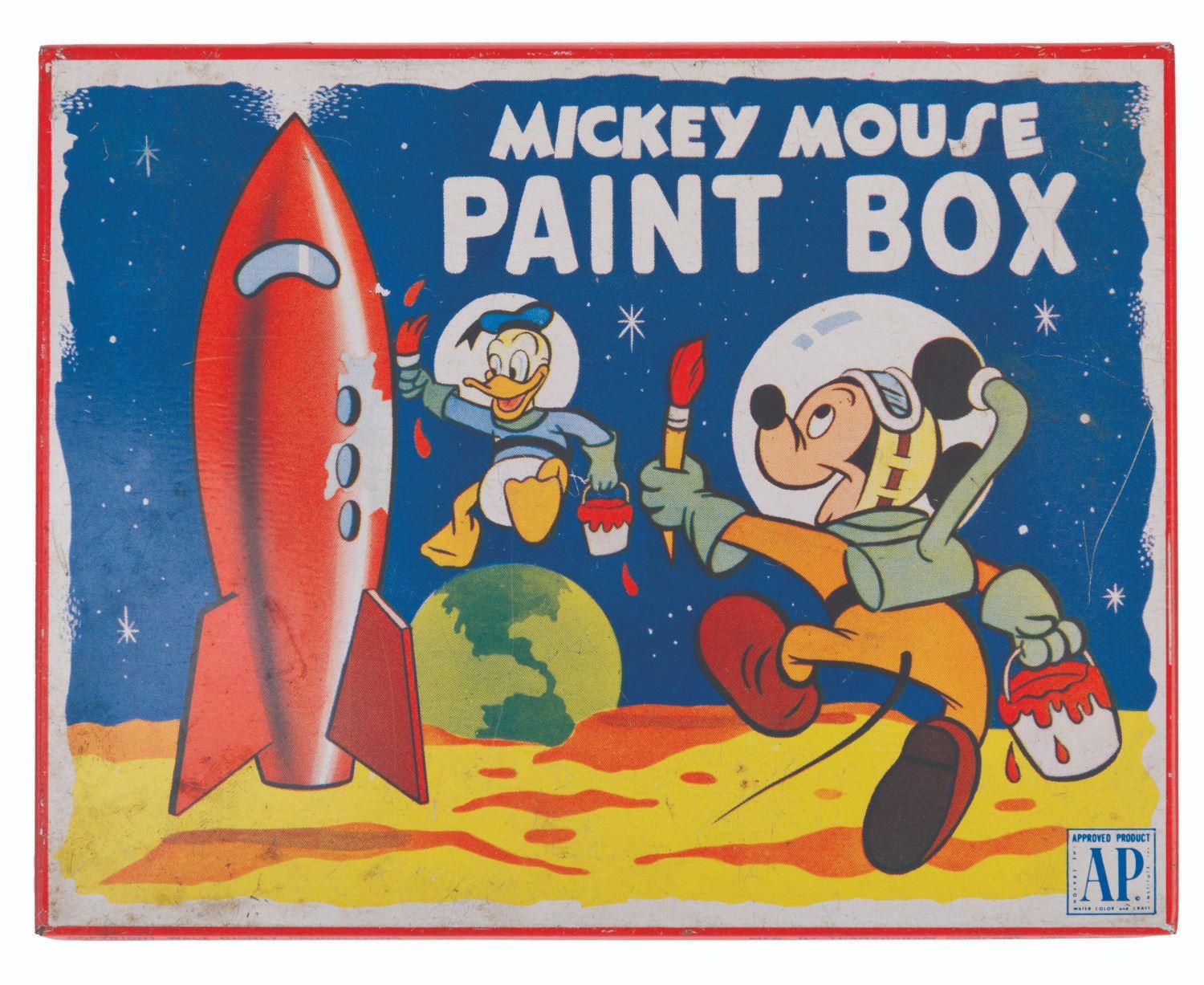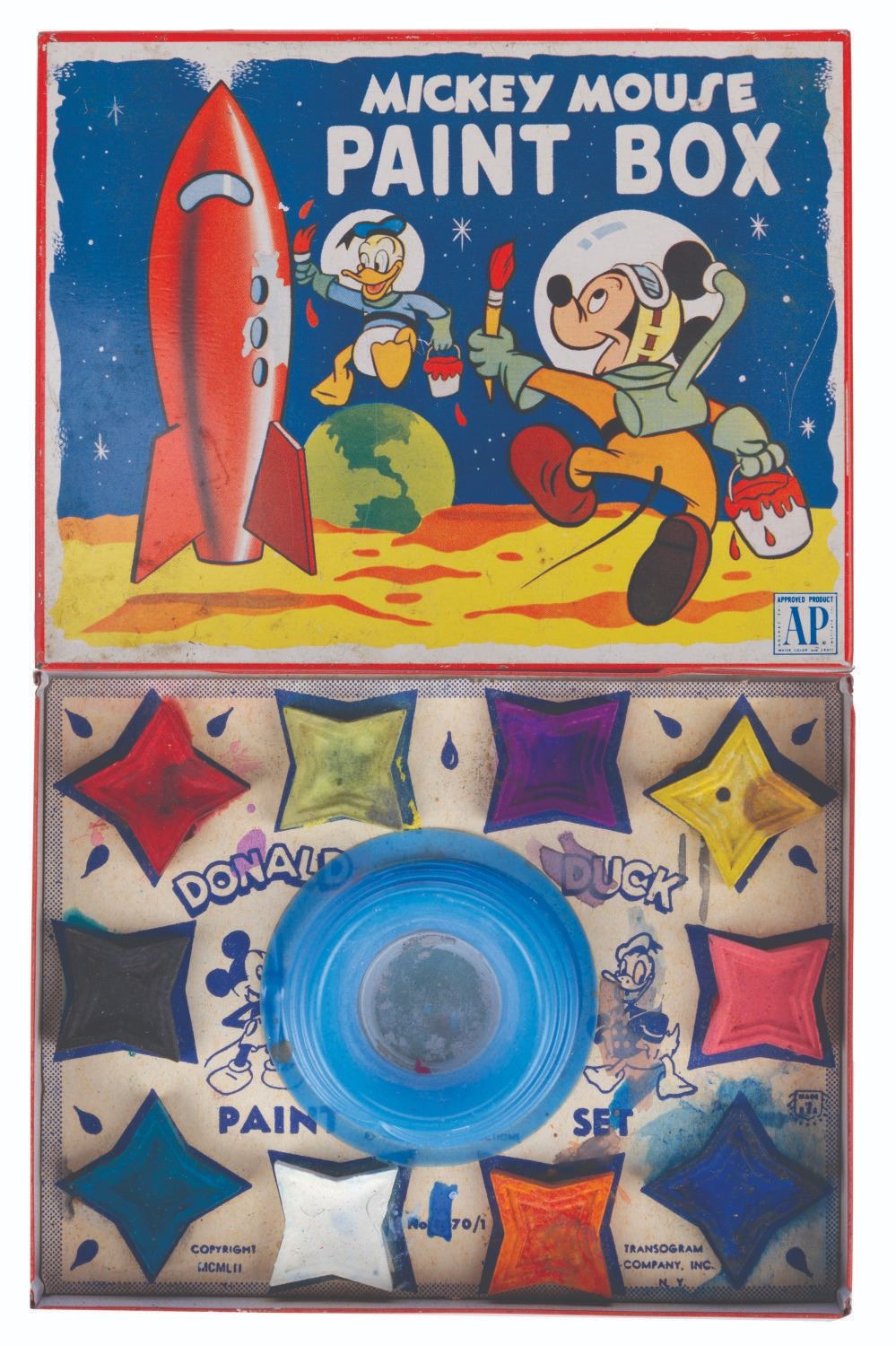 (Transogram, 1950s) A Mickey Mouse tin litho paint box featuring Mickey and Donald Duck in space. The box opens to reveal ten pigments in the shape of stars. Measuring 4.5" 5.75", the paint box is in very good condition with scratches on the front and typical wear inside from age and use.