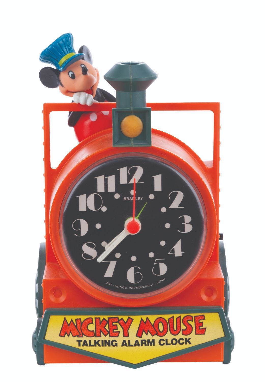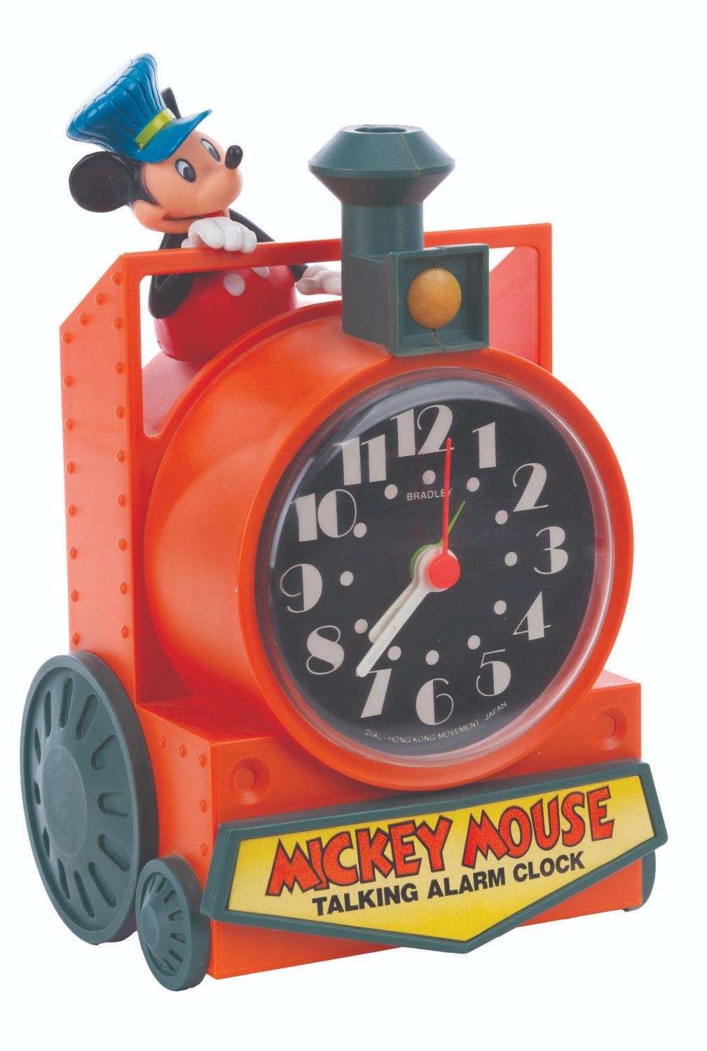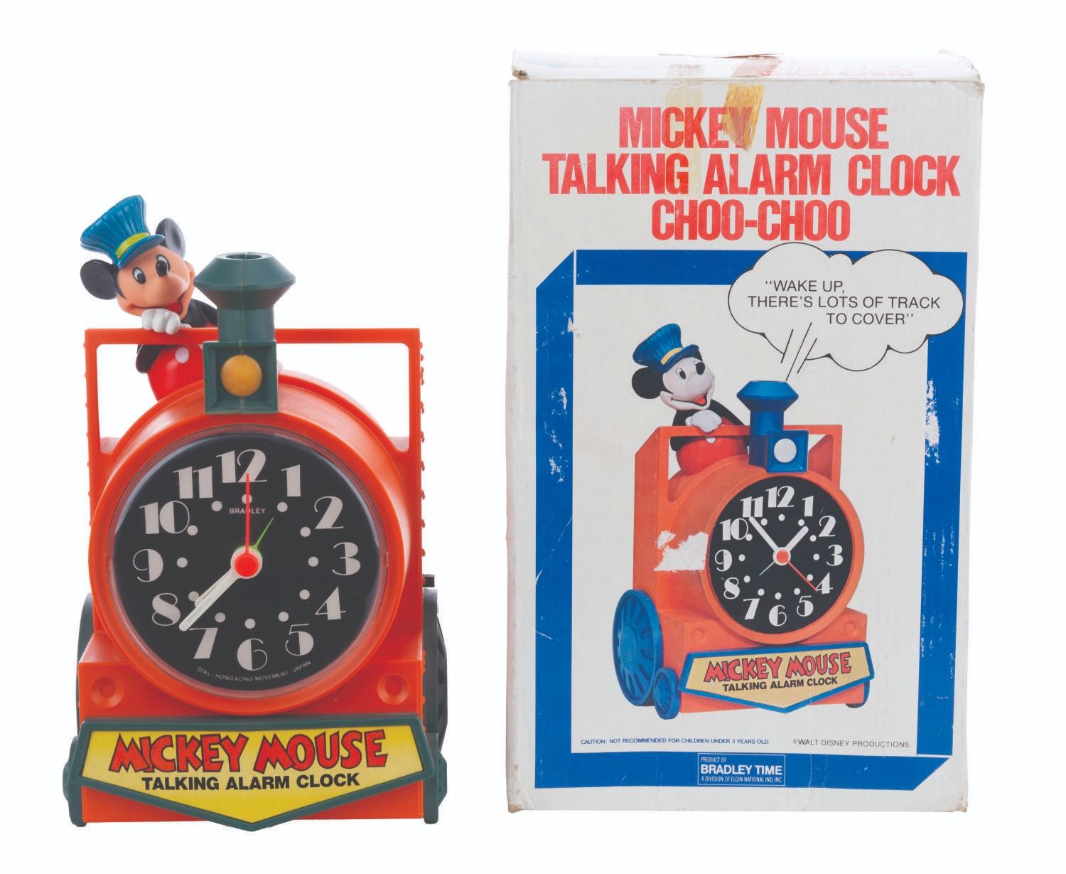 (Bradley Time, 1970s-80s) A Choo-Choo! A Mickey Mouse Talking Alarm Clock featuring Mickey as the engineer. Measuring 5.5" x 4.5" x 9" tall, the clock is tested in very good fully functioning condition using one "C" battery (not included). The clock has light wear including scratches and light paint loss to Mickey's ears, and the battery compartment doesn't stay closed on its own.