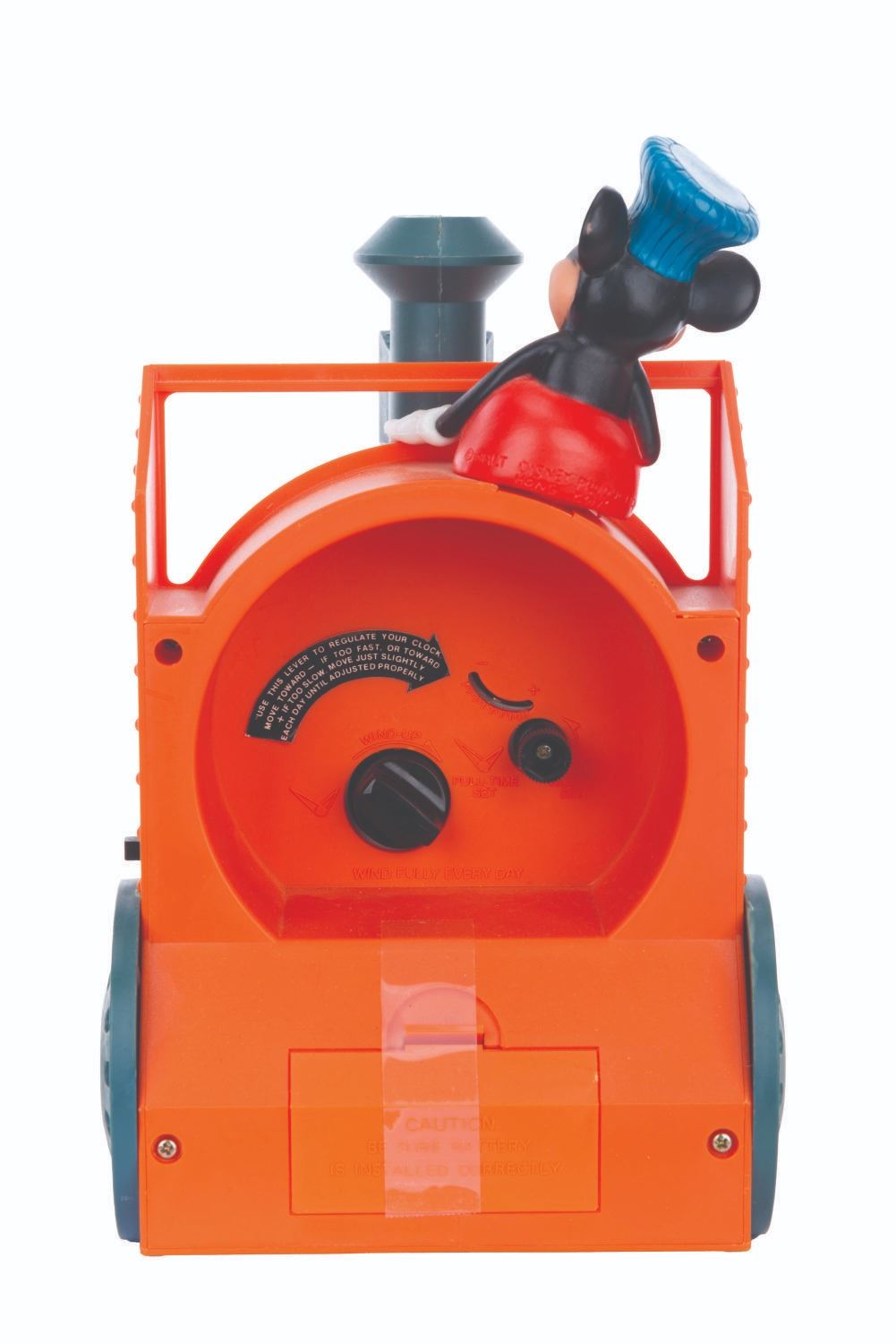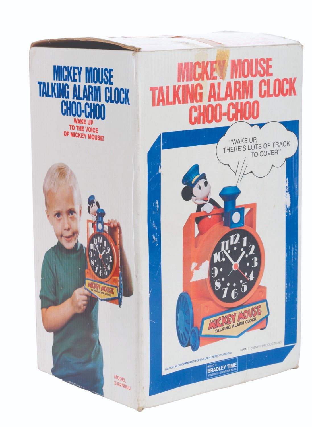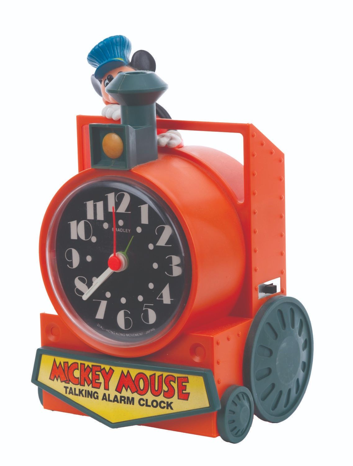 (Bradley Time, 1970s-80s) A Choo-Choo! A Mickey Mouse Talking Alarm Clock featuring Mickey as the engineer. Measuring 5.5" x 4.5" x 9" tall, the clock is tested in very good fully functioning condition using one "C" battery (not included). The clock has light wear including scratches and light paint loss to Mickey's ears, and the battery compartment doesn't stay closed on its own.