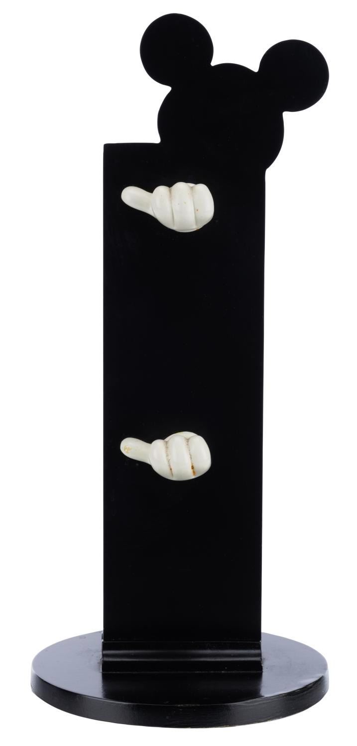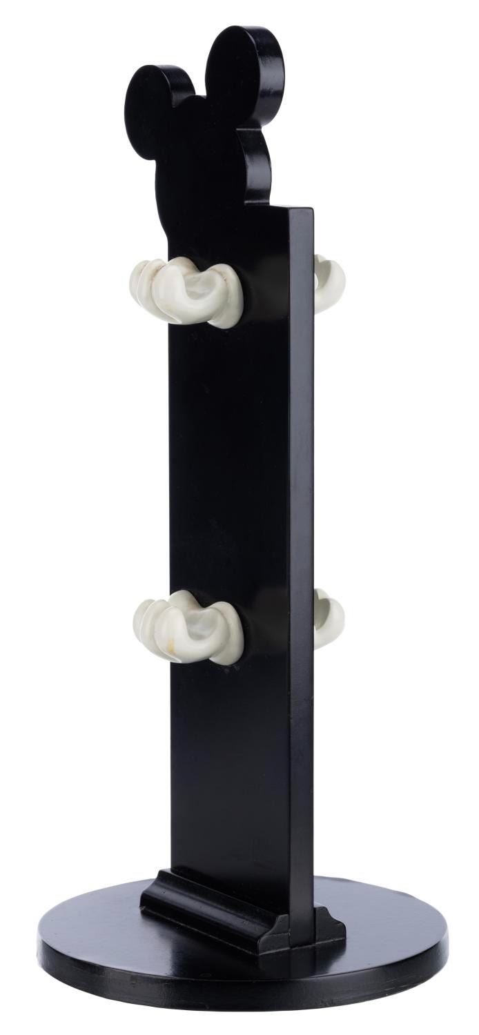 (Disney, 1980s-2000s) A wooden Mickey Mouse mug stand with four white gloved hands to hold four mugs. Measuring 15” tall and 6.75” in diameter, the stand displays in good condition with stains, scratches, and wear.