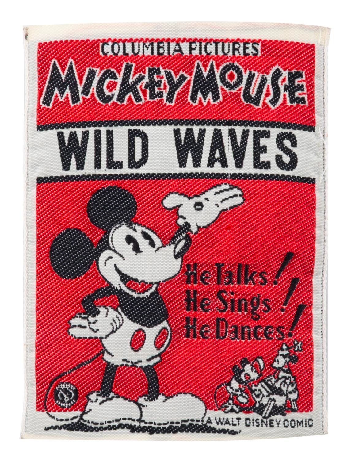 (1970s-90s) An iron-on patch of the poster for the 1929 Columbia Pictures short "Wild Waves" starring Mickey Mouse. Measuring 3" x 4", the patch is in very good condition with light wear.