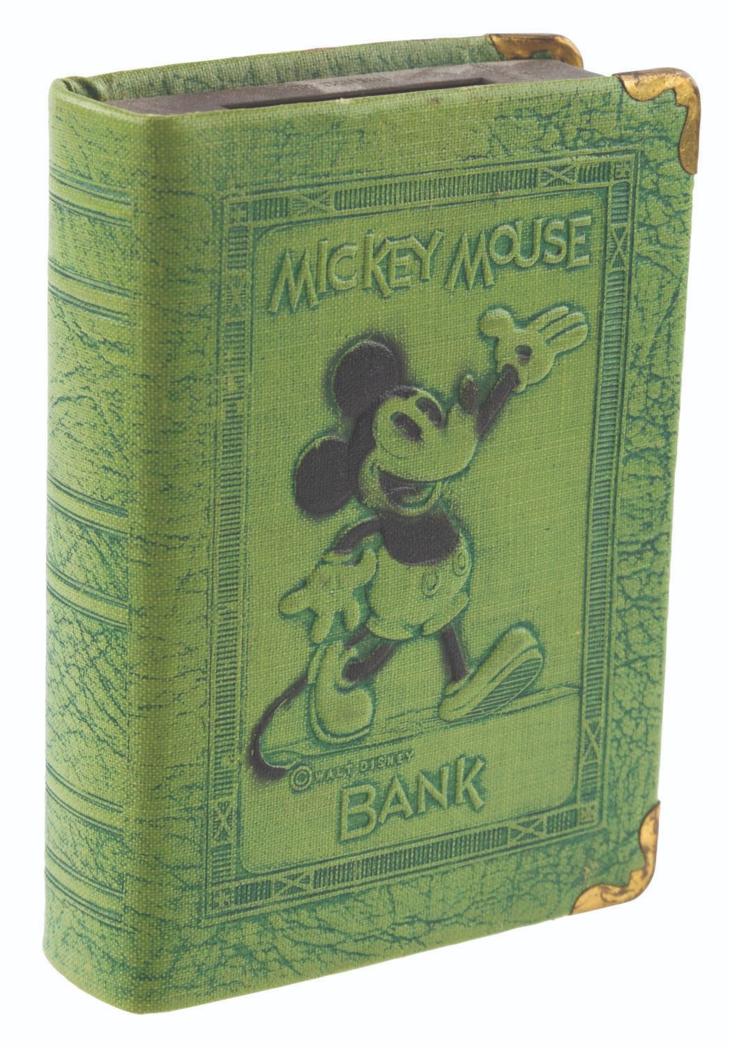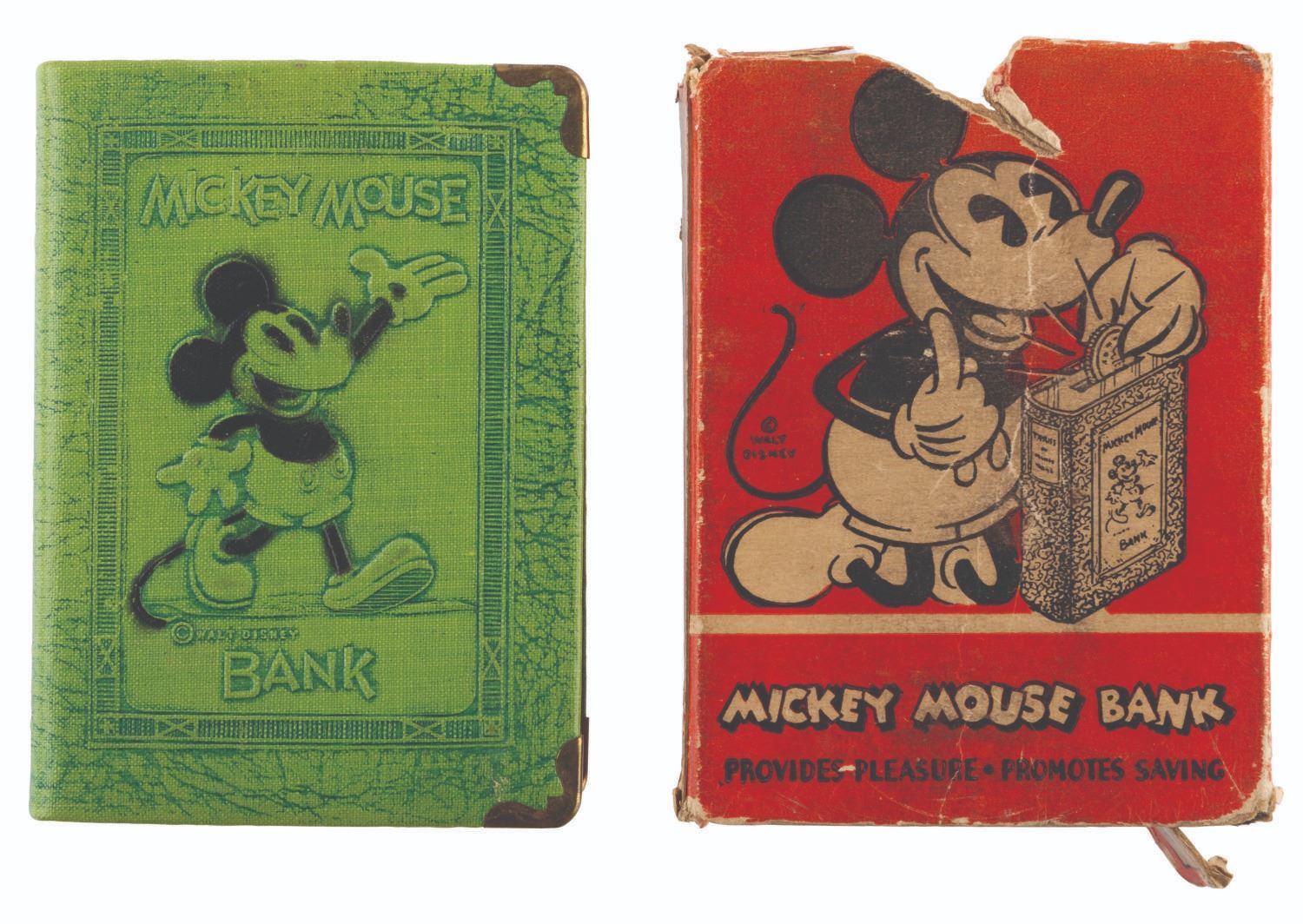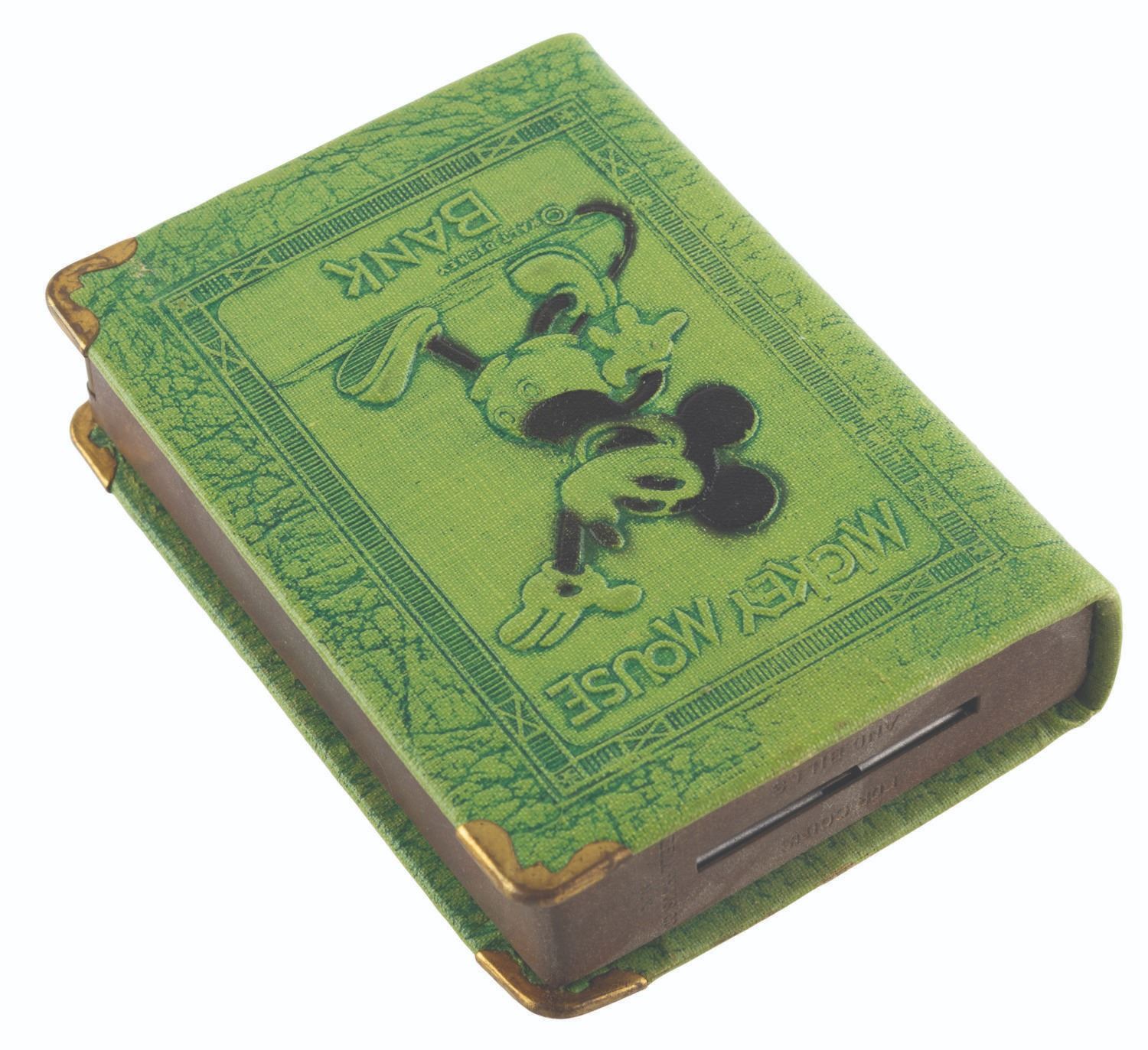 (Zell, 1933) A charming 1930s book bank featuring Mickey Mouse, with the rarely-retained original packaging. Measuring 3.25" x 1" x 4.25" with its 3.25" x 1.25" 4.5" tall box, the cast metal bank features a hinged door at the bottom and is in very good condition with light wear, oxidation and discoloration from age, while the box is in fair condition with tears up to 2" long creases, wear, and the lid missing.