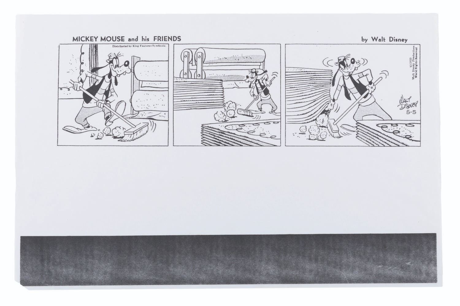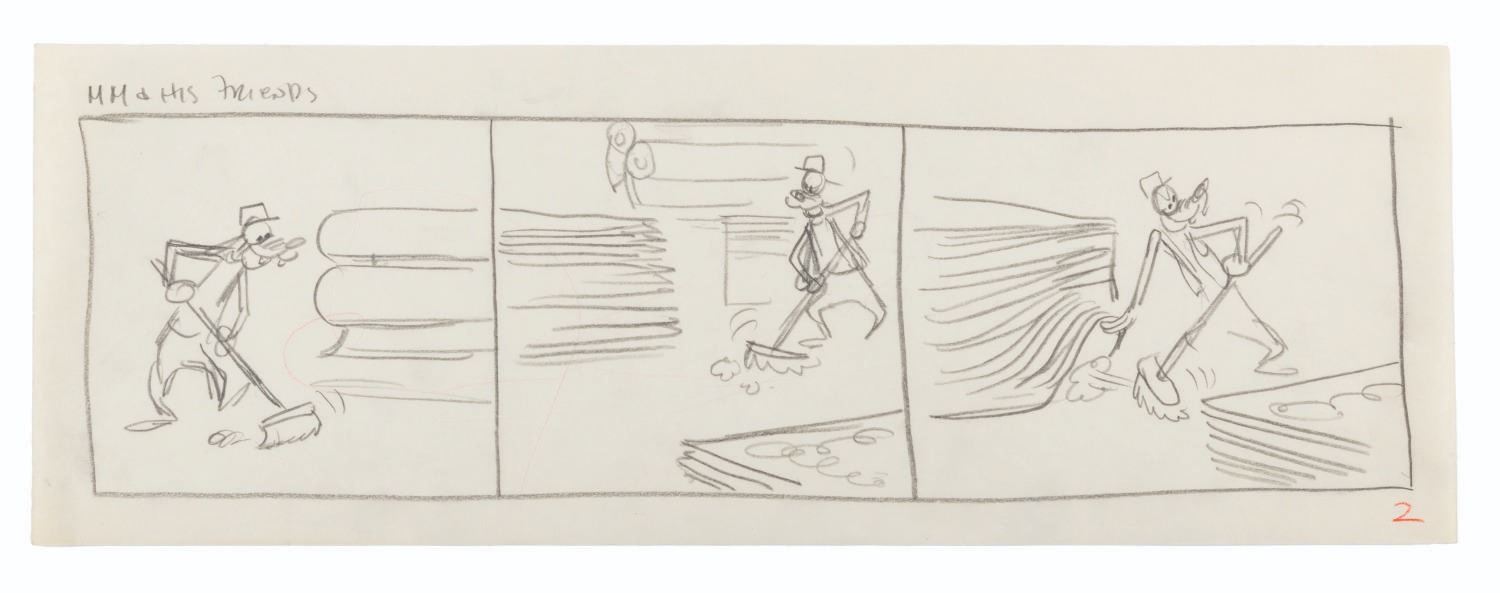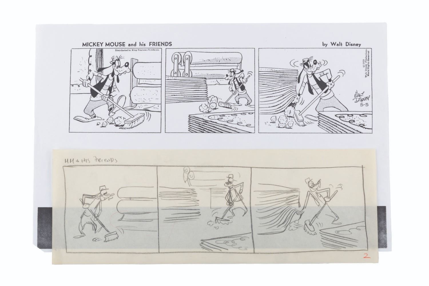(Disney, 1959) An original story drawing for a Mickey Mouse and his Friends comic strip from May 5, 1959, starring Goofy. Measuring 5.5" x 15.5", the graphite and colored pencil art is in very good condition, with light creases and wear. Included is an 11" x 17" printout of the final comic.
