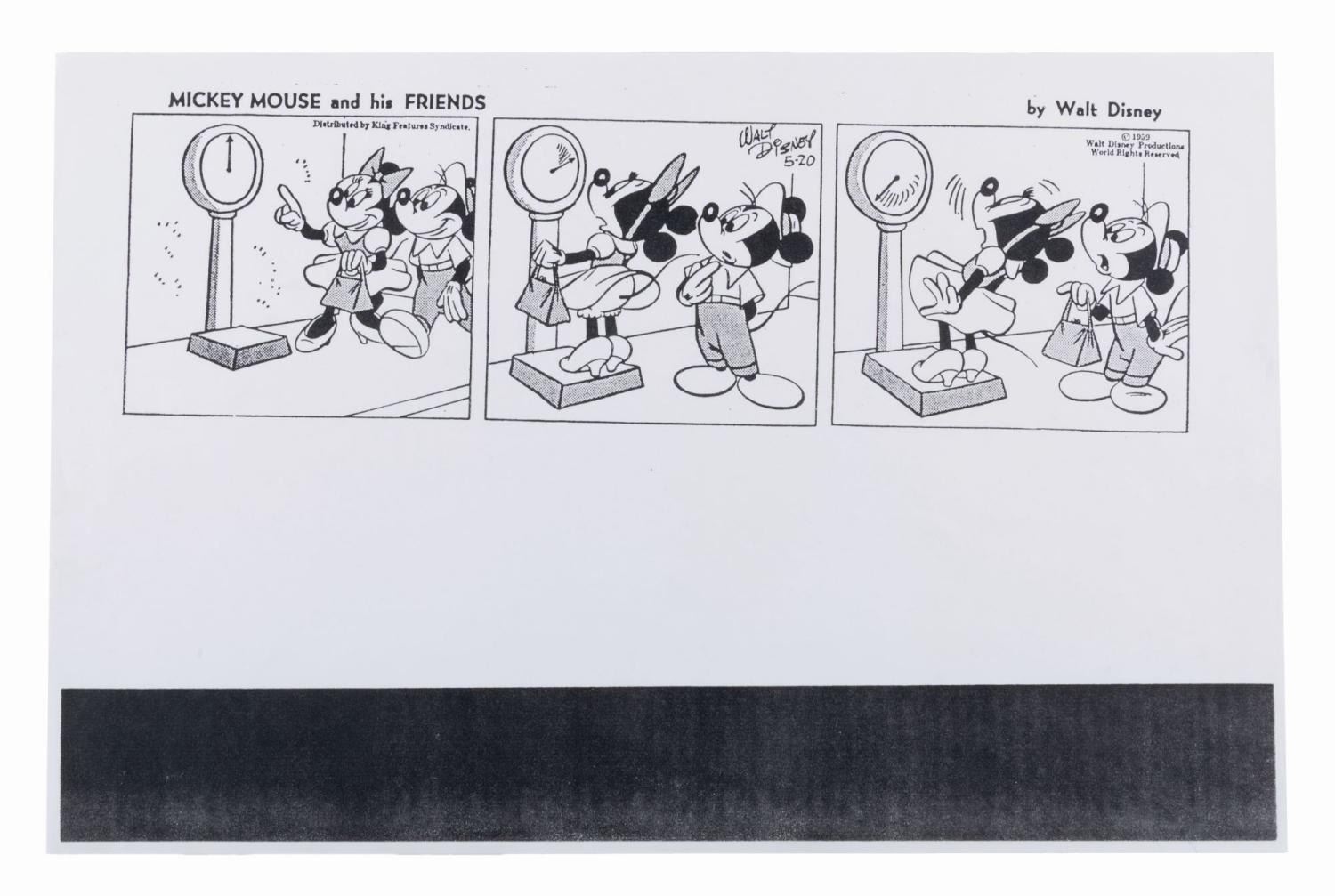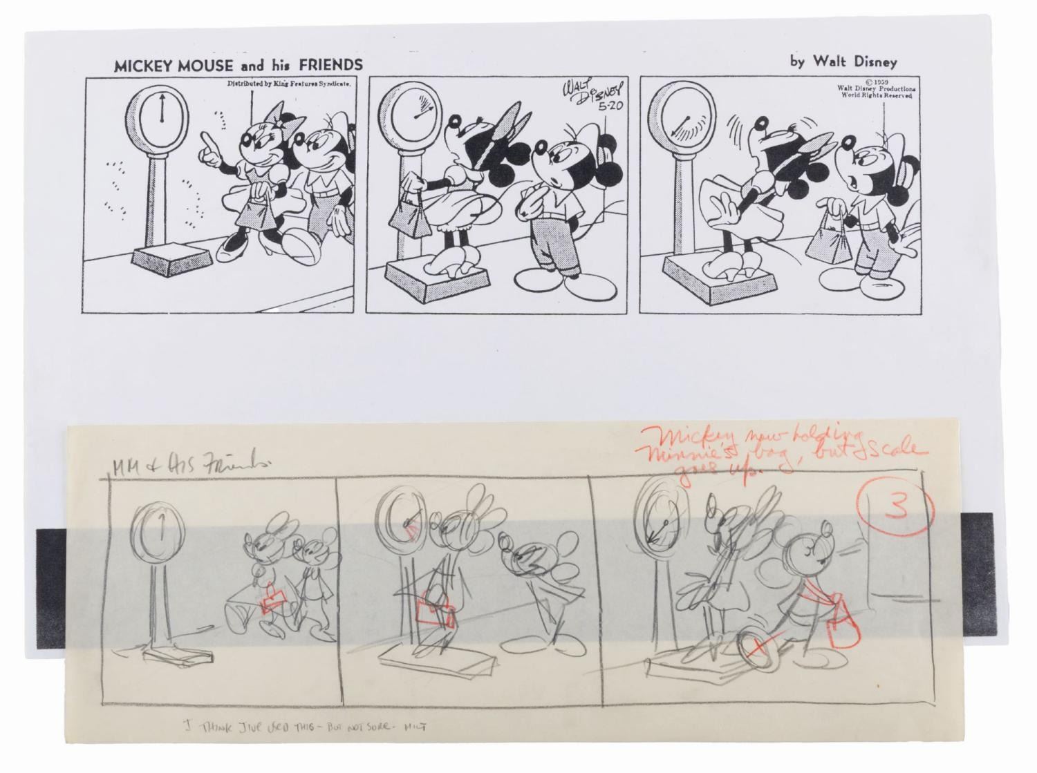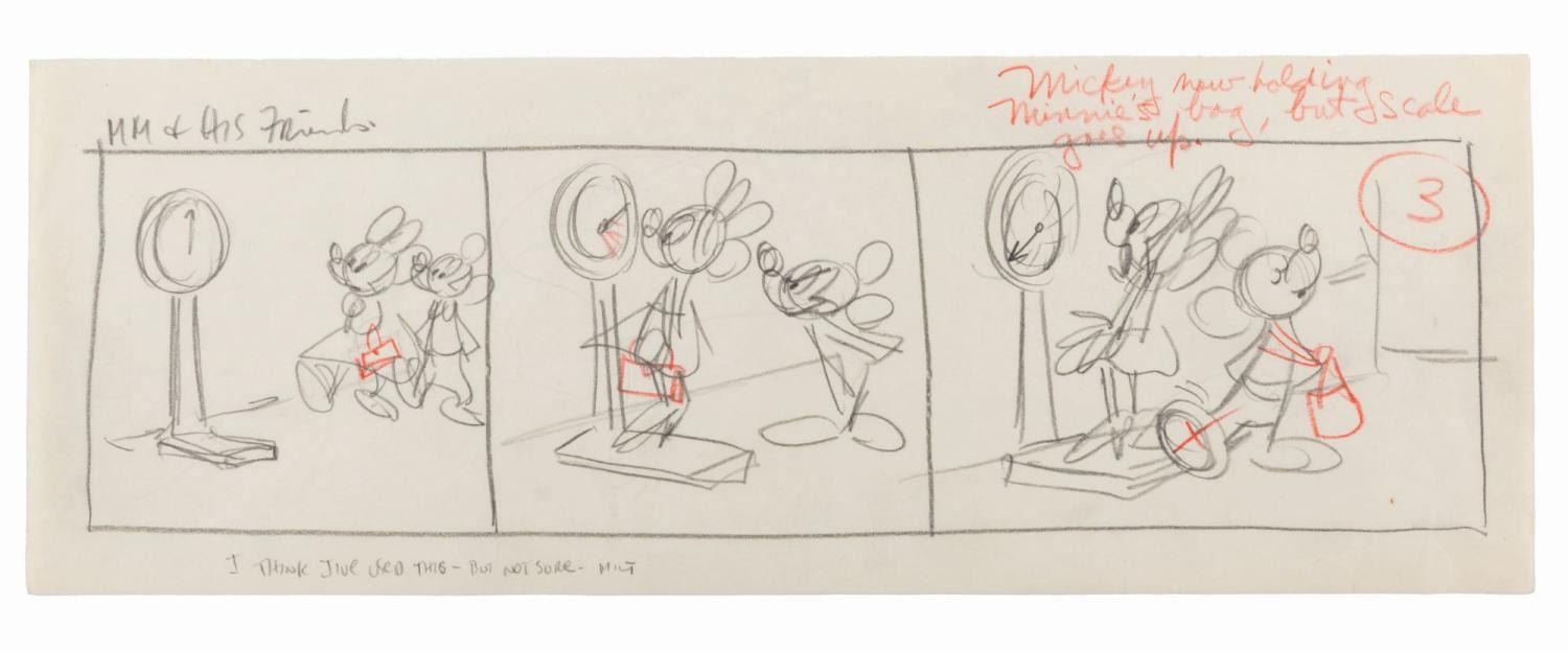 (Disney, 1959) An original story drawing for a Mickey Mouse and His Friends comic strip from 1959 by artist Milt Banta, who wrote a note at the bottom. In the original graphite and colored pencil drawing, Mickey mischievously sneaks his foot onto the scale to make Minnie think she's heavier than she is, a gag that was removed for the final strip. Measuring 5.5" x 15.5", the art is in very good condition with light wear and a spot of discoloration. Included is an 11" x 17" printout of the final comic.