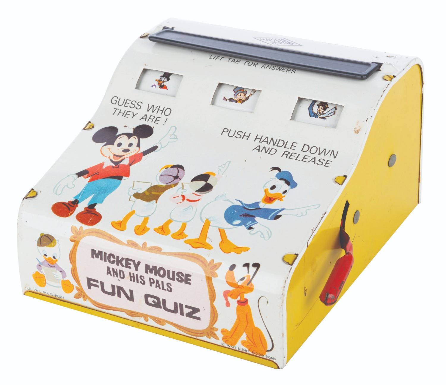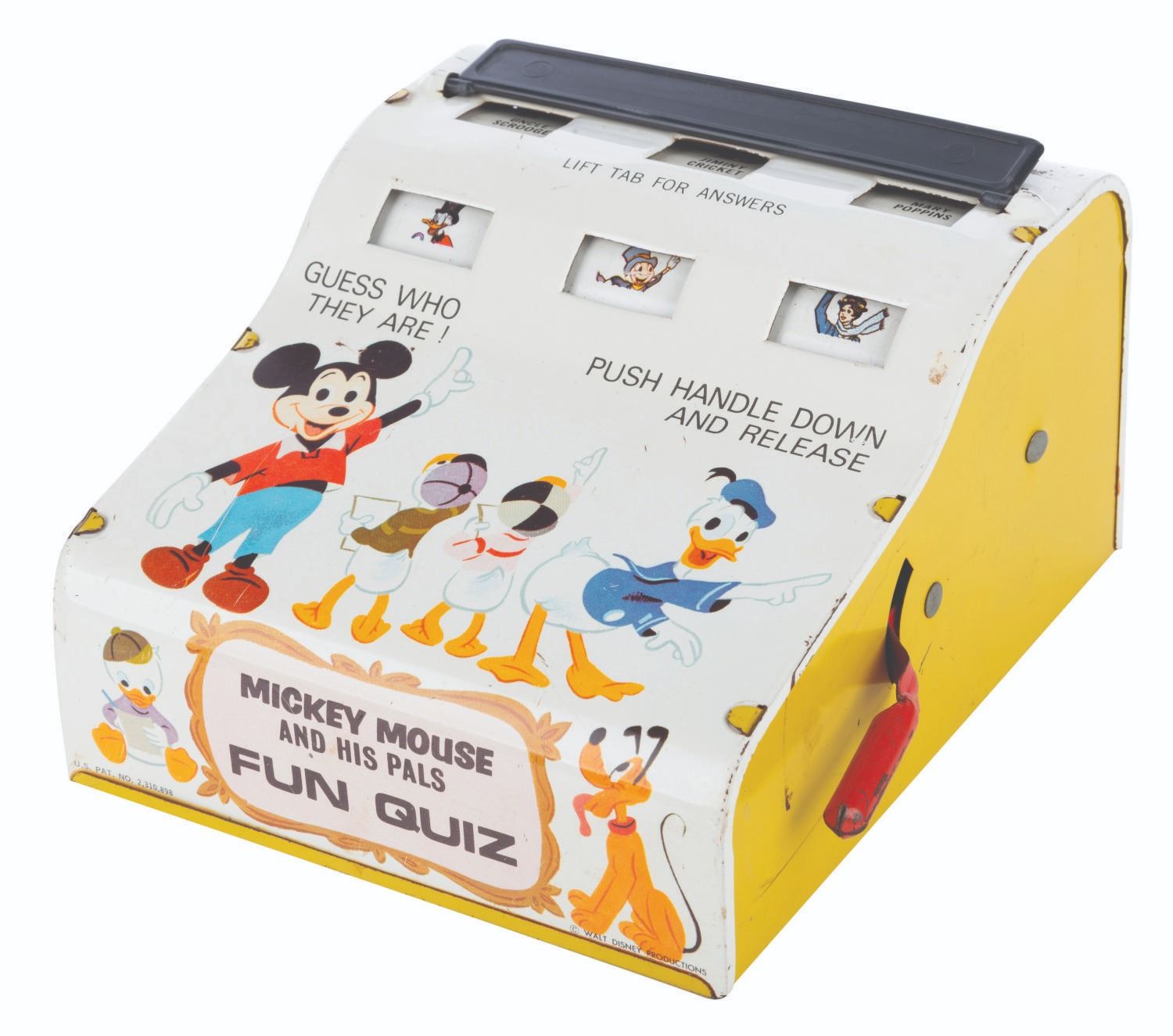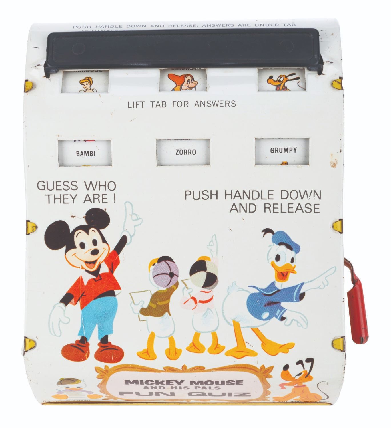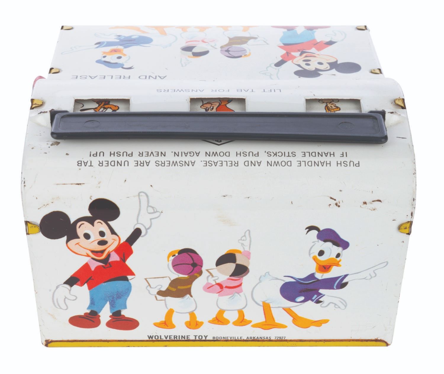 (Wolverine Toy, 1970s) A Mickey Mouse and His Pals Fun Quiz game by Wolverine Toy. The lever-activated toy familiarizes players with Disney characters, revealing their names and pictures under the tab. Measuring 6.25"x4"x7.25", this tin lithograph toy is in very good condition with scuffs and wear to the lithographic images and faint oxidation to some areas.