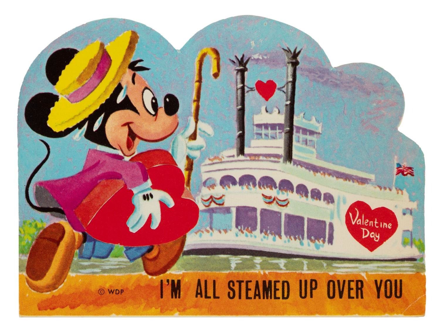 (Disneyland, 1960s) A Valentine's Day card of Mickey Mouse and the Mark Twain at Disneyland. Measuring 4.75" x 3.5", the card is in very good condition with a name written on the back and light wear.