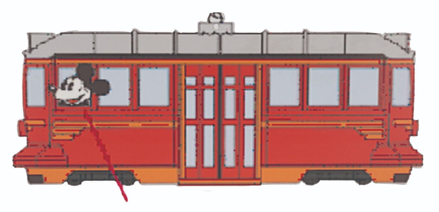 (Disney California Adventure, 2000s) A decoration depicting Mickey Mouse aboard the Buena Vista Street Red Car Trolley. Measuring 18"x8.5", the foam core piece is in good condition exhibiting faint scuffs, small dents, and light wear from its original Park display.