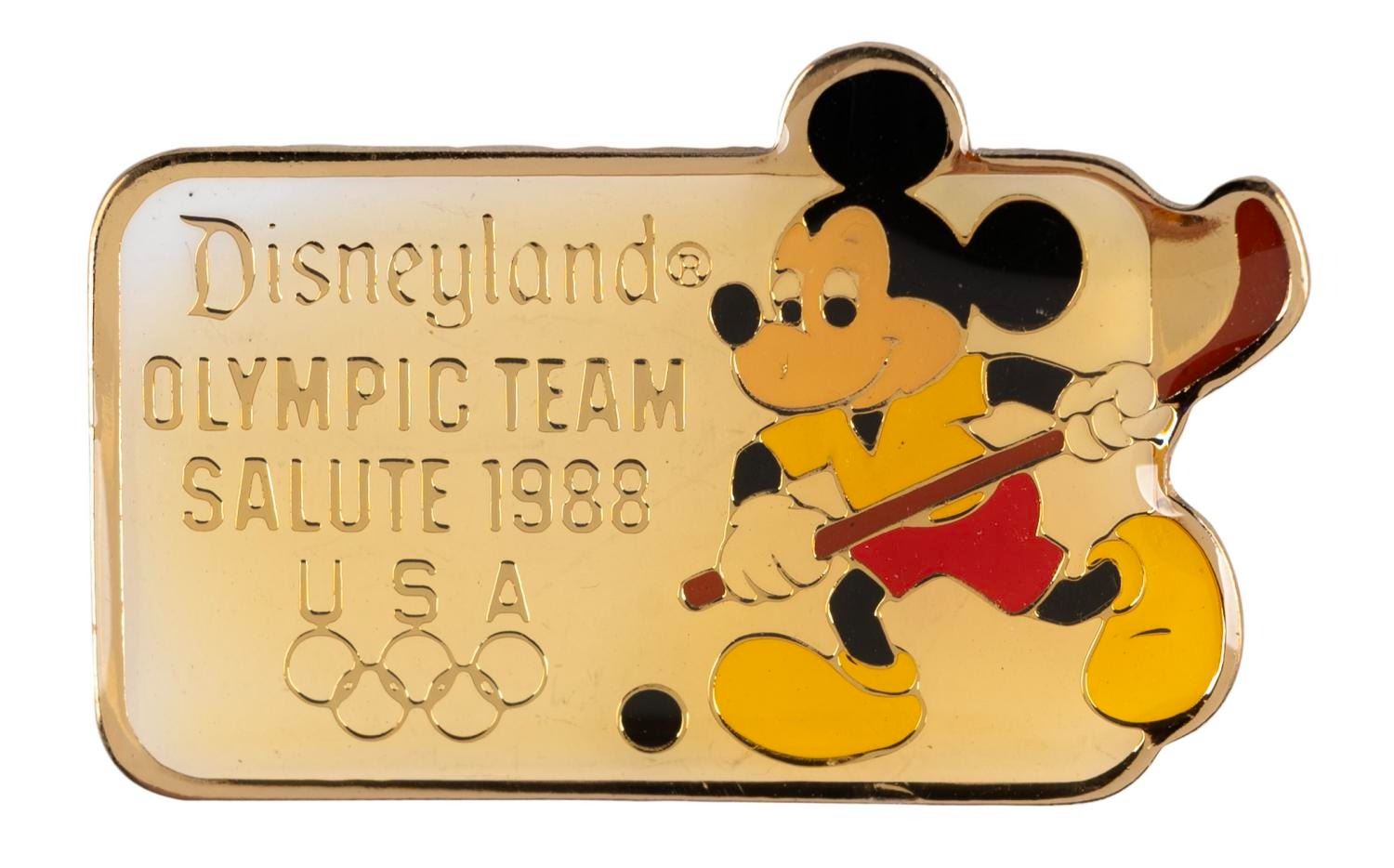 (Disneyland, 1988) A Disneyland Olympic Team Salute 1988 pin, featuring Mickey Mouse playing field hockey. Measuring 0.75” x 1.25”, the pin is in very good condition with light discoloration from age.