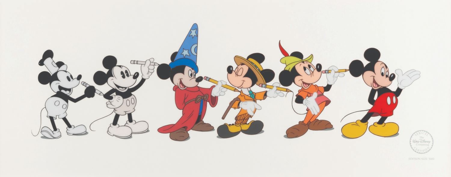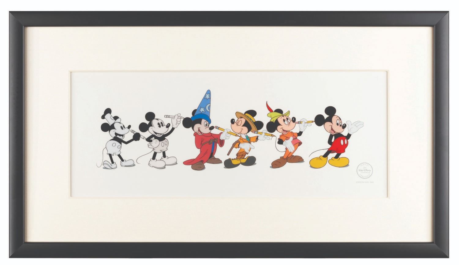 (Disney, 1993) A “Mickey Through the Years” sericel released in a limited edition of 5,000 in celebration of Mickey Mouse’s 65th birthday. With an image size of 5.25” x 17” on a visible 8” x 20” cel, the piece displays in fine condition.