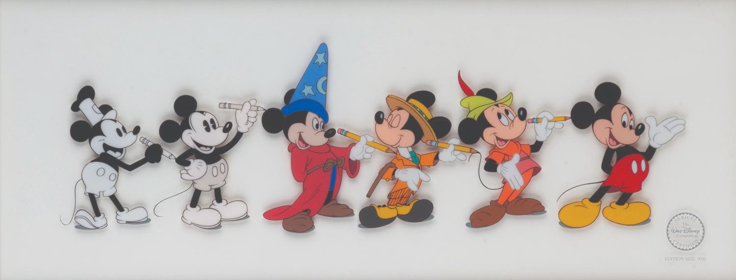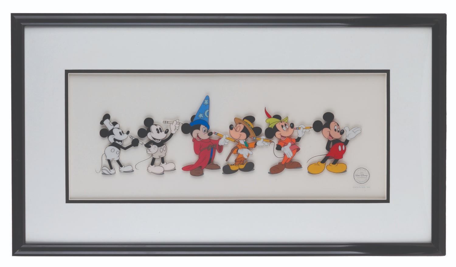 (Disney, 1993) A “Mickey Through the Years” sericel released in a limited edition of 5,000 in celebration of Mickey Mouse’s 65th birthday. With an image size of 5.25” x 17” on a visible 8” x 20” cel, the piece displays in fine condition with light scuffs to the frame.