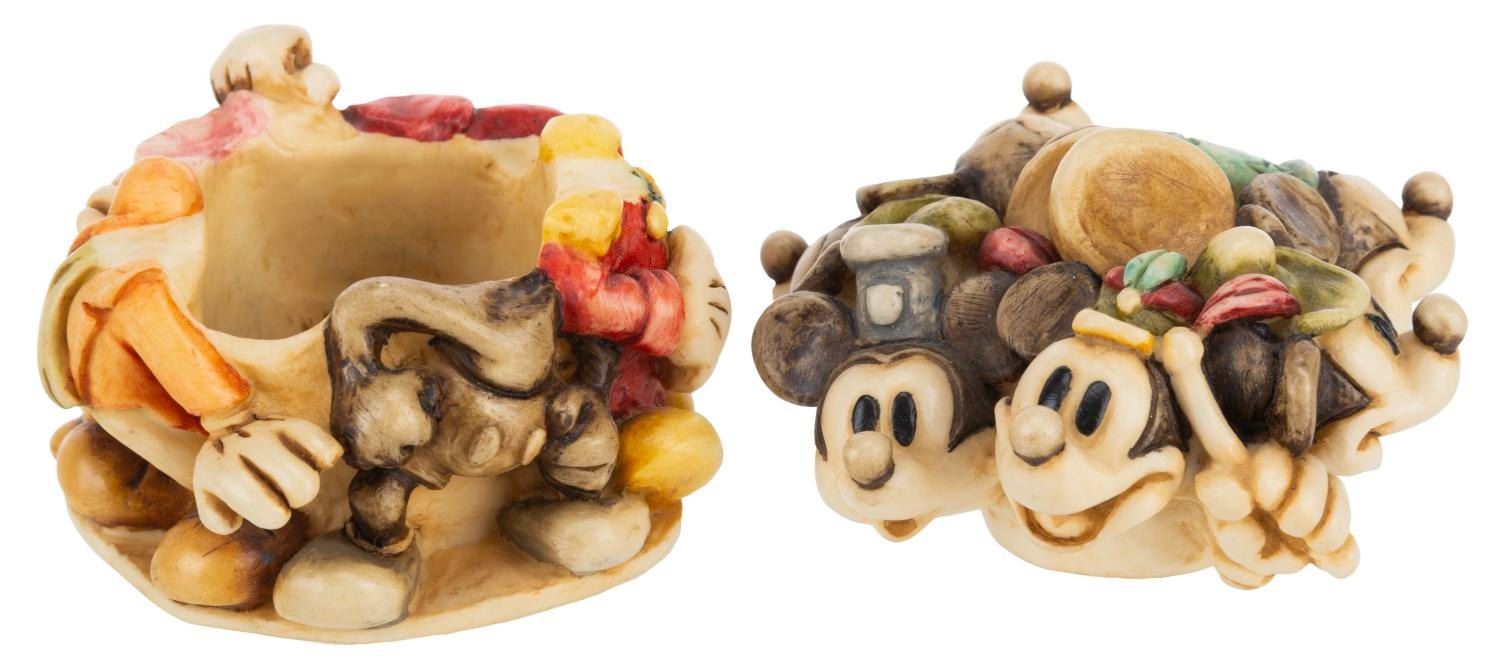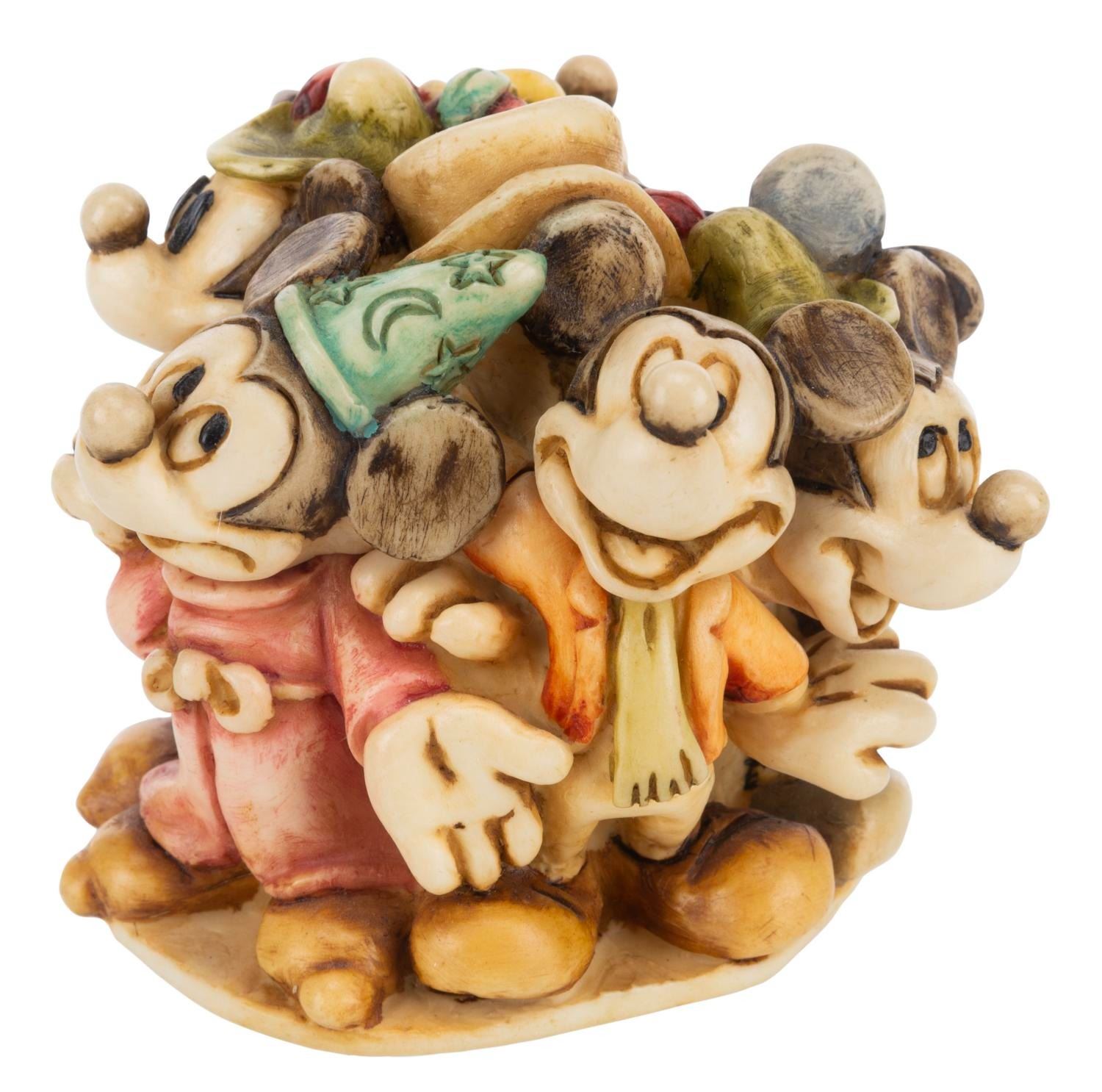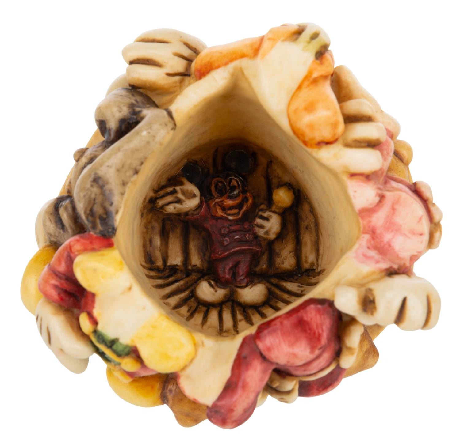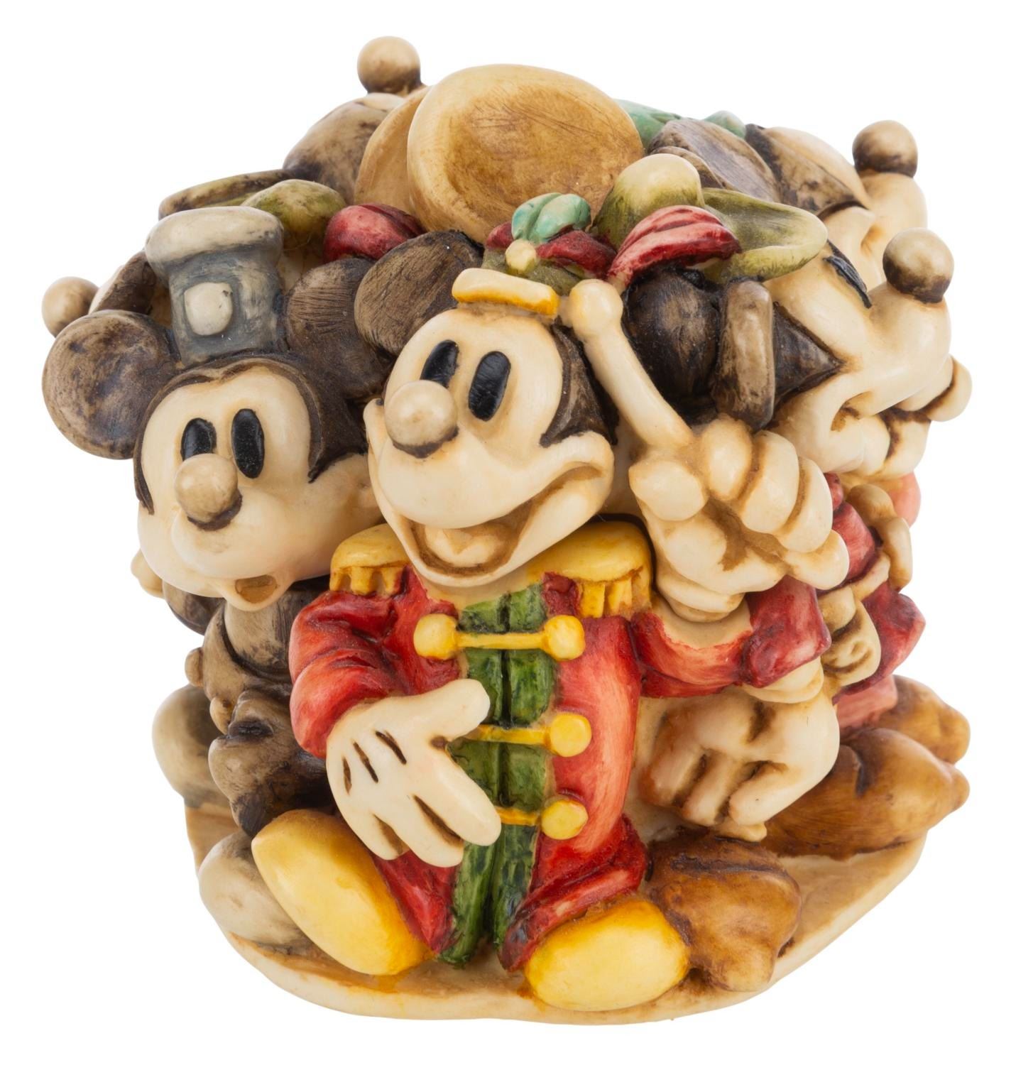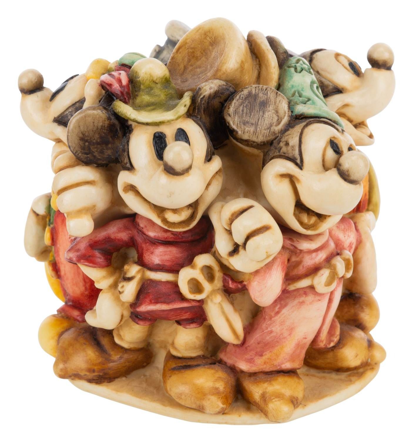 (Harmony Kingdom, 2000) A figural trinket box titled “Mickey Through the Years” of Mickey dressed in outfits from some of his most famous cartoons. Accomplished in resin, the figure heads lift off to reveal a hidden compartment. Measuring 2.25” x 2.75” x 2.75” tall, the box is in fine condition.