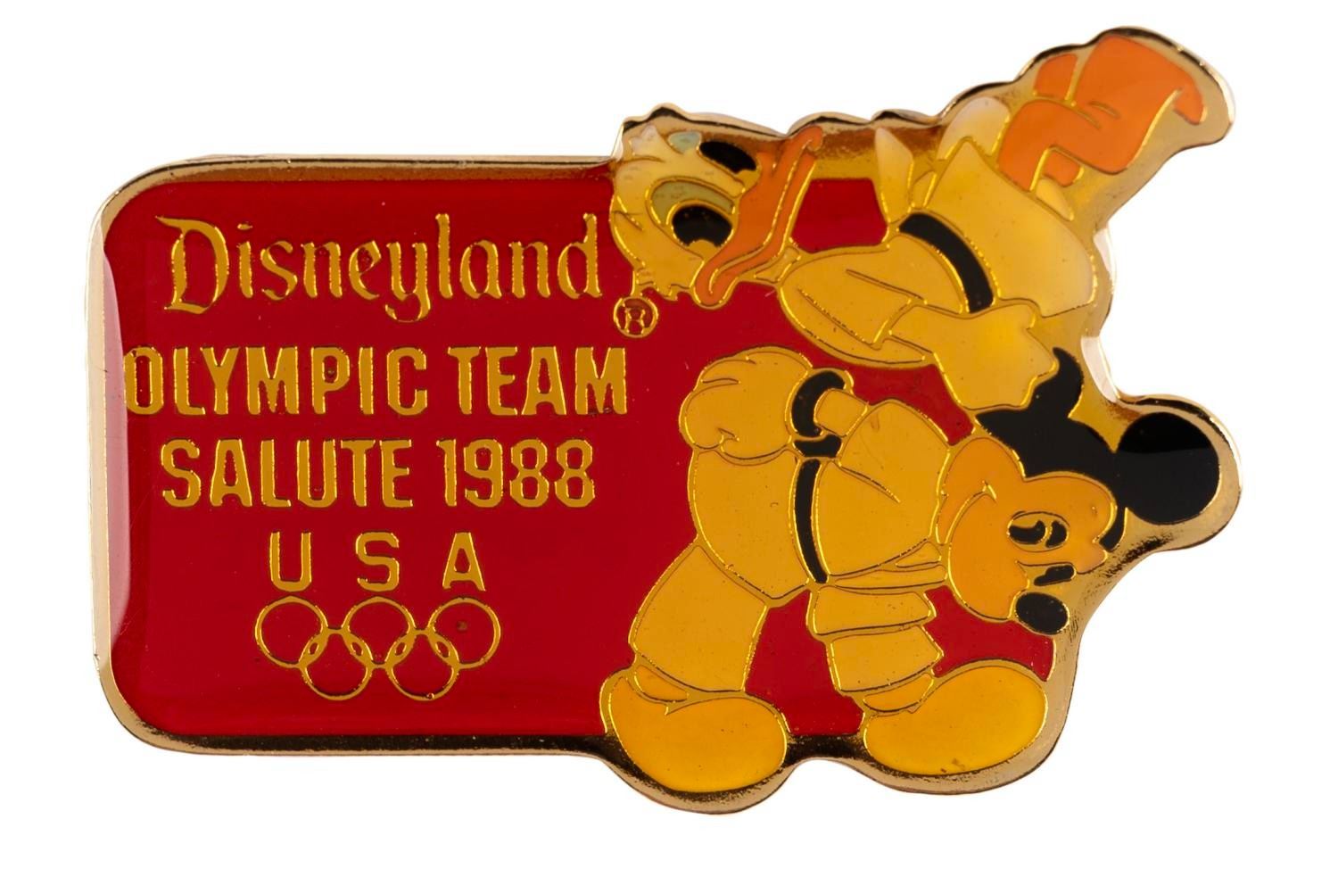 (Disneyland, 1988) A Disneyland Olympic Team Salute 1988 pin, featuring Donald Duck and Mickey as martial artists. Measuring 1.5" wide, the pin is in very good condition with color shift from age.