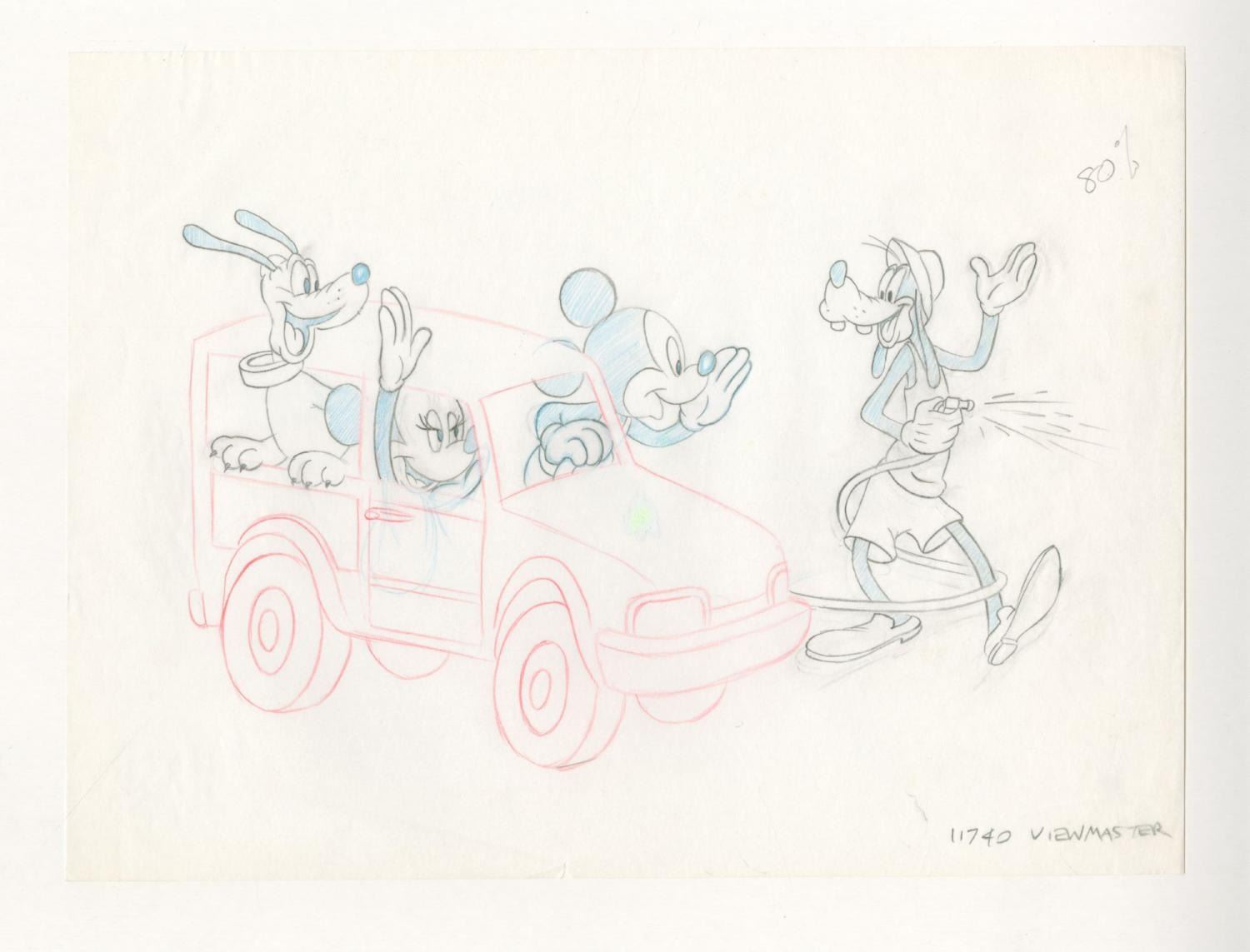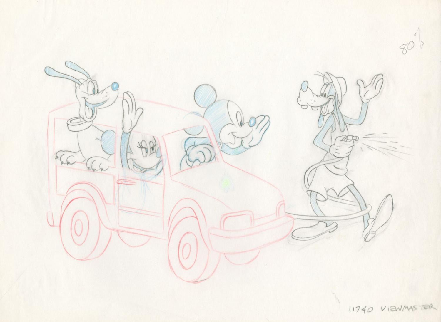 (Disney, 1980s) An original development drawing of Mickey and friends for a View-Master slide. The graphite and colored pencil drawing was created at the Studio and used to create a color image on a View-Master Reel. The characters have an image size of 6” x 10” on a 9" x 12" sheet. The artwork is in very good condition with light creasing, a tiny chip, a tear along the bottom edge, and a white-out covered spot.