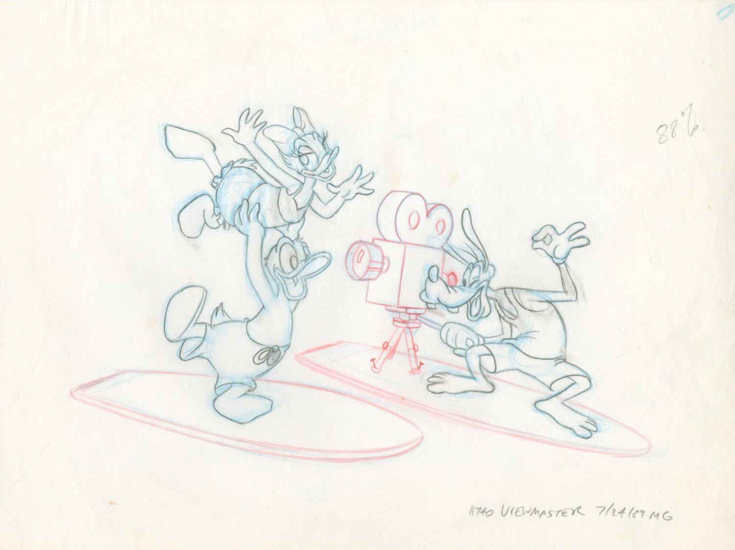 (Disney, 1980s) An original development drawing of Donald, Daisy, and Goofy for a View-Master slide. The graphite drawing was created at the Studio and used to create a color image on a View-Master reel. Donald and friends have an image size of 5.75” x 9.5” on a 9" x 12" sheet. The artwork is in very good condition with light creasing and a small spot of paper loss on the right edge.