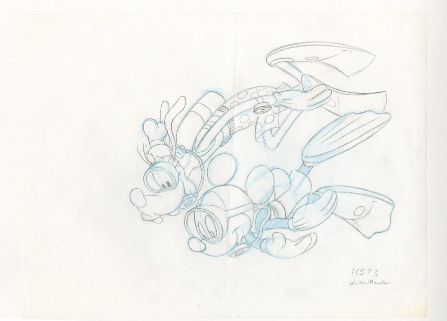 (Disney, 1980s) An original development drawing of Mickey and Goofy scuba-diving for a View-Master slide. The graphite and colored pencil drawing was created at the Studio and used to create a color image on a View-Master reel. Mickey and Goofy have an image size of 6.25” x 8” on a 9" x 12" sheet. The artwork is in very good condition with light creasing.