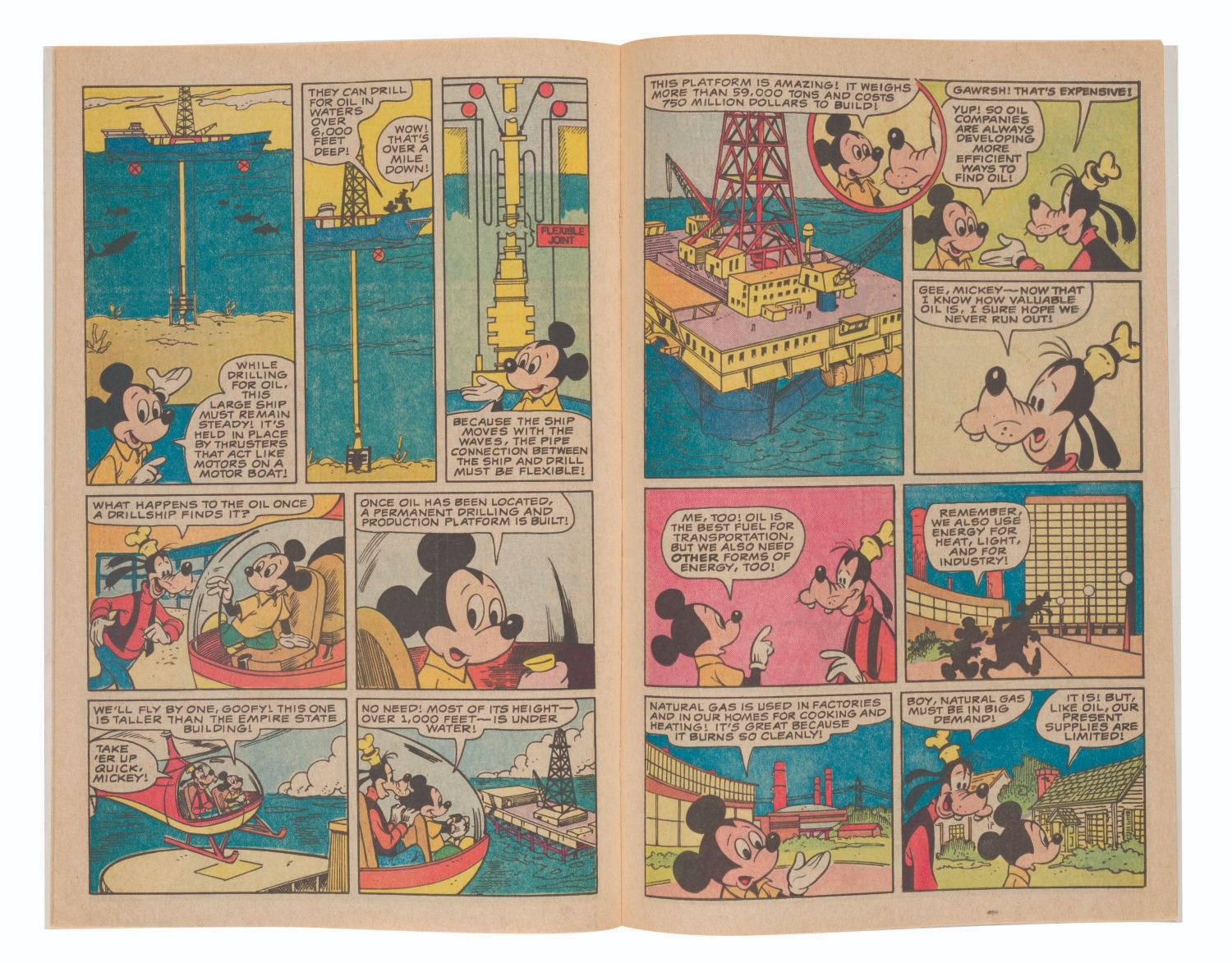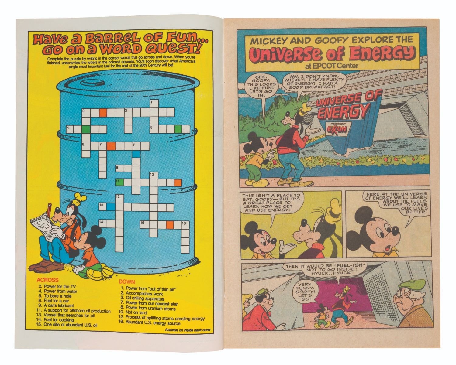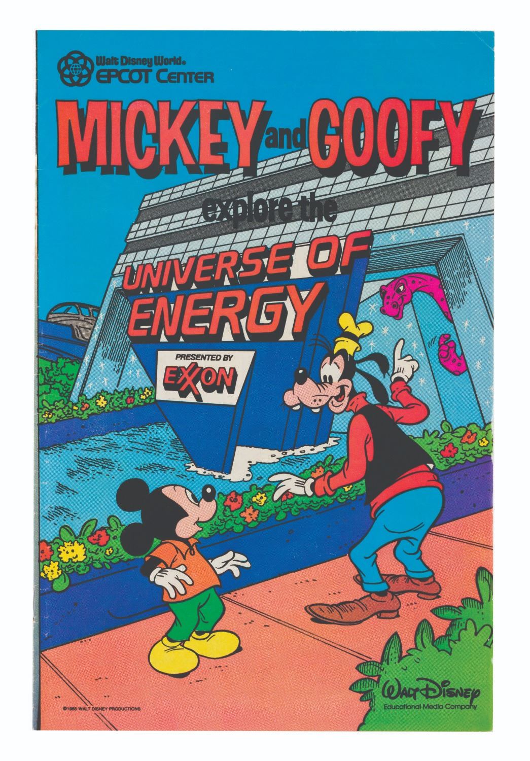 (Disney, 1985) A Walt Disney World EPCOT Center Mickey and Goofy Explore the Universe of Energy educational comic book. The comic book is in fair condition with light handling wear, creases to one page, and a 1” tear to the back cover.