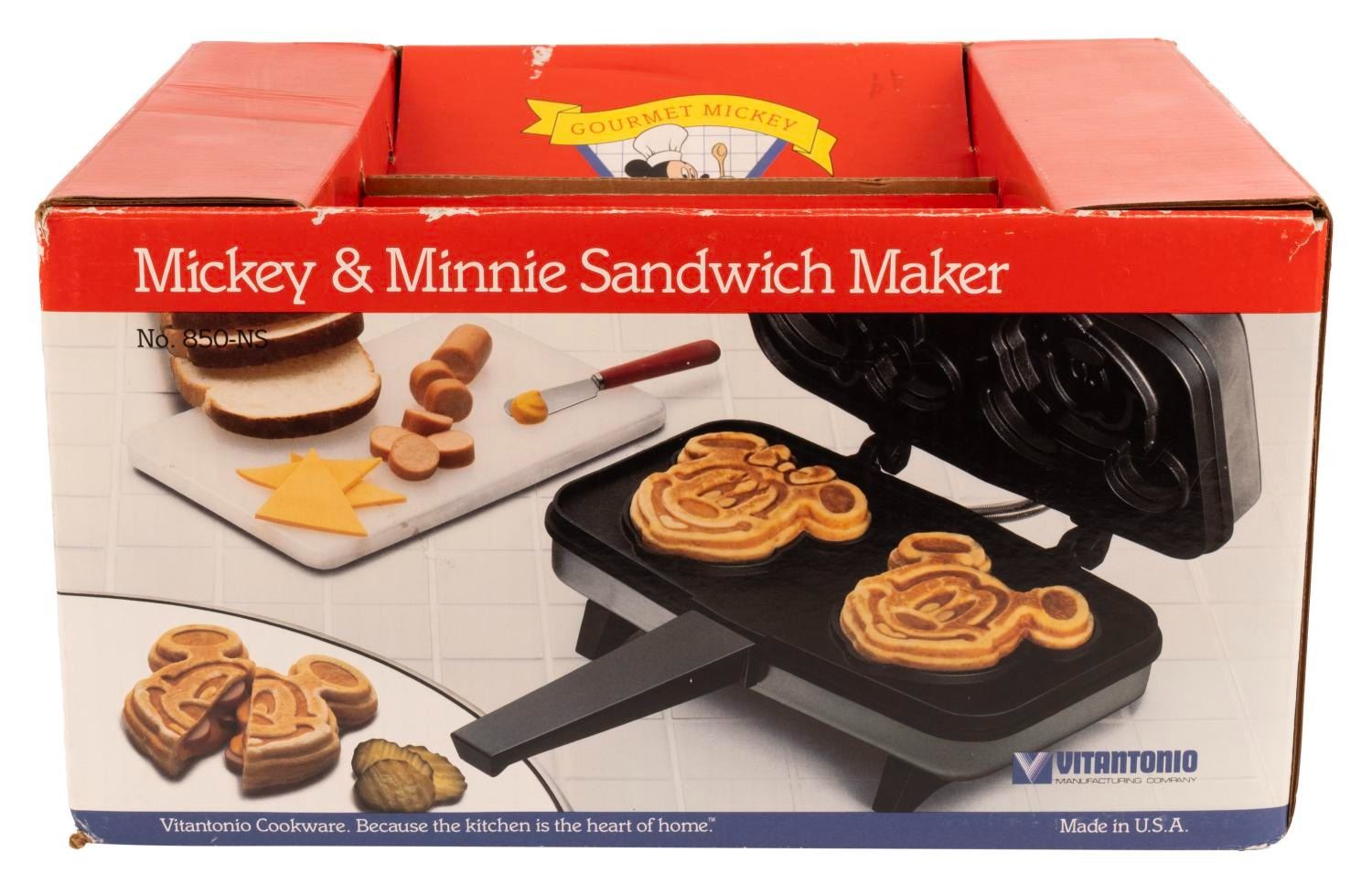 (Vitantonio, 1991) A Gourmet Mickey sandwich maker with molds for Mickey and Minnie-shaped sandwiches. Measuring 10.5” x 13.5” x 4.5” tall with its original 11.5” x 14.5” x 7.75” tall box, the non-stick sandwich maker displays in very good condition with heavy surface scratches.