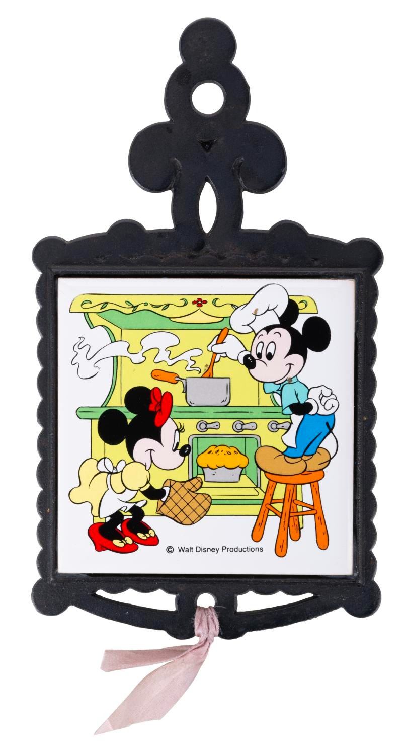 (Disneyland, 1970s-80s) A decorative cast iron and tile trivet featuring Mickey and Minnie Mouse. Measuring 9.25"x5.25", the trivet displays in fine condition with light surface wear and faint oxidation to the iron.