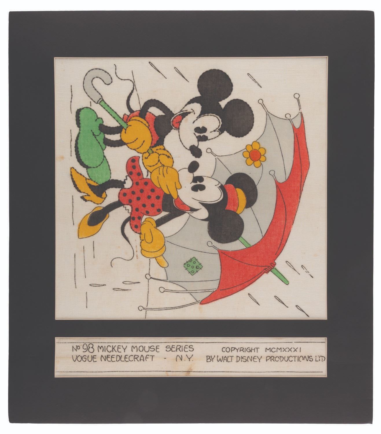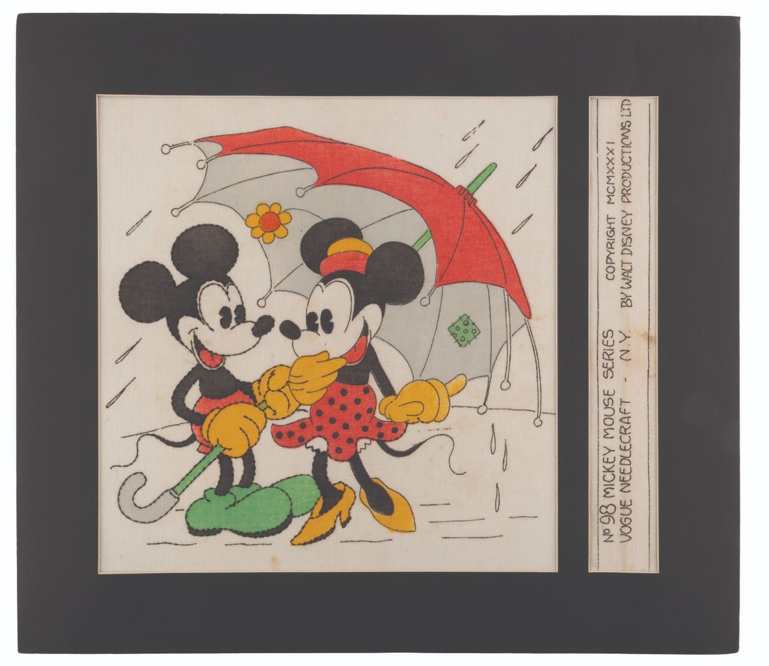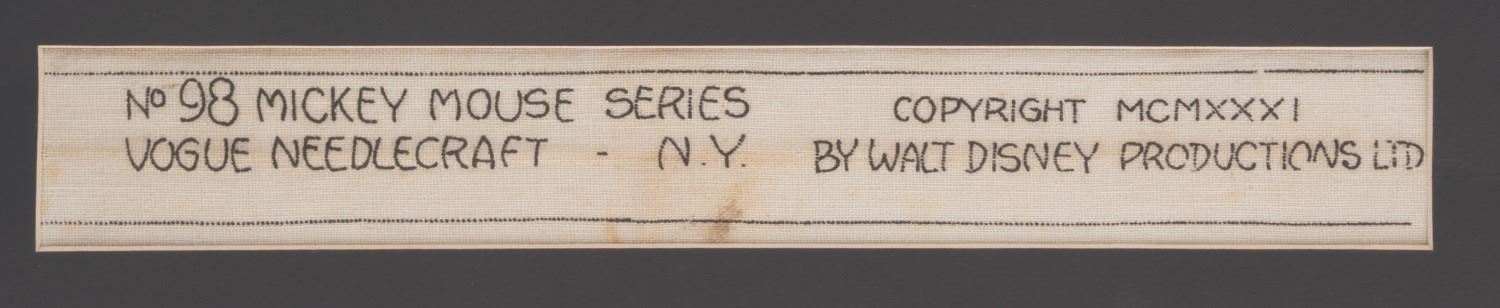 (Vogue Needlecraft, 1931) An unfinished No. 98 Mickey and Minnie needlecraft pillowcase embroidery. The linen fabric was sold with a pre-colored pattern that the consumer would embroider by following the outline with a needle and thread. Measuring 14” x 13.5” and presented in a double window matte measuring 19” x 21.5” and 14” x 2” with the pattern’s title and copyright information, the linen displays in good condition with stains throughout, light edge wear and creasing to the matte, and light discoloration from age.