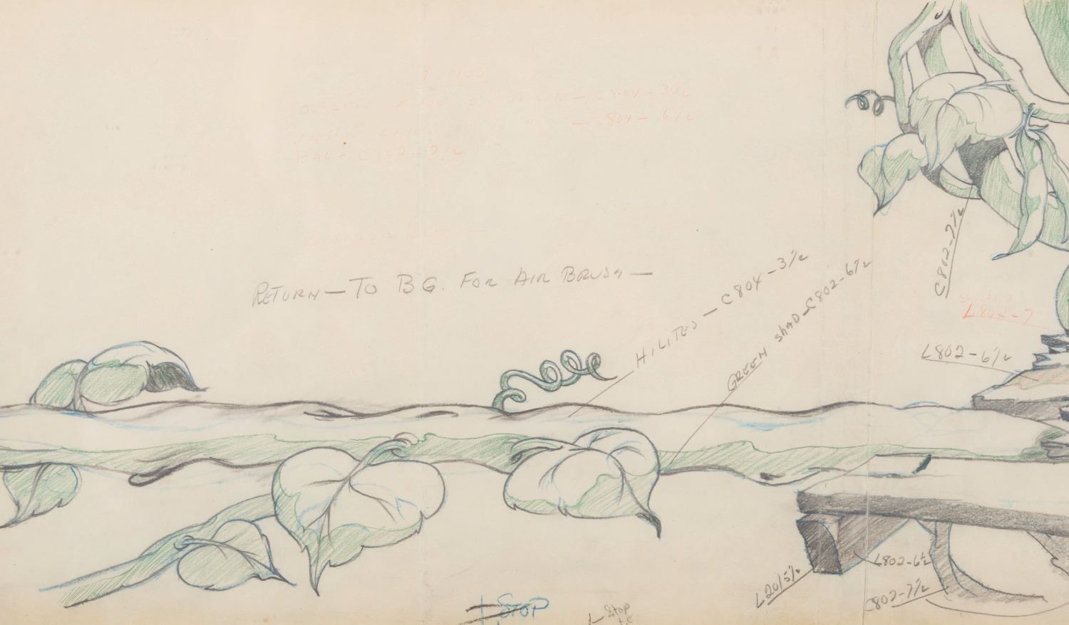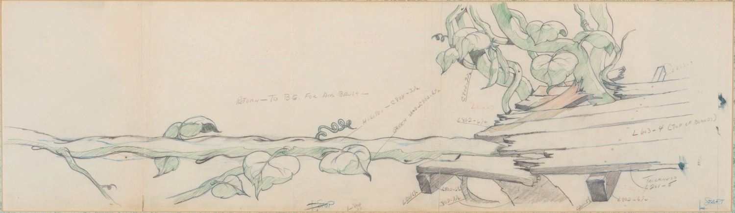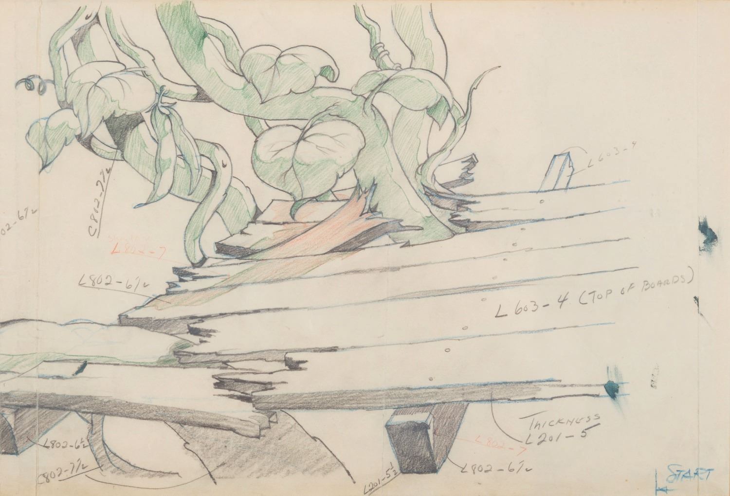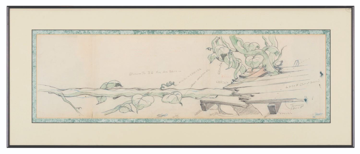 (Disney, 1947) An original layout drawing of the beanstalk from the"Mickey and the Beanstalk" segment of"Fun and Fancy Free." The graphite and colored pencil drawing is displayed in an 8.75" x 30.5" visible window of a 15" x 36.75" framed matte. The drawing is in good condition with creases, wear along the folds, paint smudges, and a 1" tear, while the frame displays in good condition with scratches, scuffs, wear, and a crack at the top right corner.