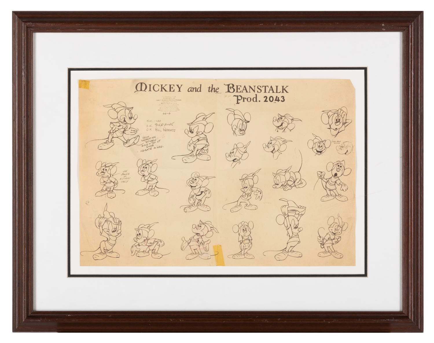 (Disney, 1947) An original photostat model sheet for Mickey in the Mickey and the Beanstalk segment of "Fun and Fancy Free." Model sheets such as this were distributed to animators and crew working on the film to ensure character design continuity. 11” x 16.25” in a 12” x 17.5” visible window of a 19” x 24.25” framed matte, the model sheet displays in very good condition with folds, creases, tape, wear, pinholes from production use, and edge wear and tears including a missing top right corner. The frame is in good condition with scratches and wear.