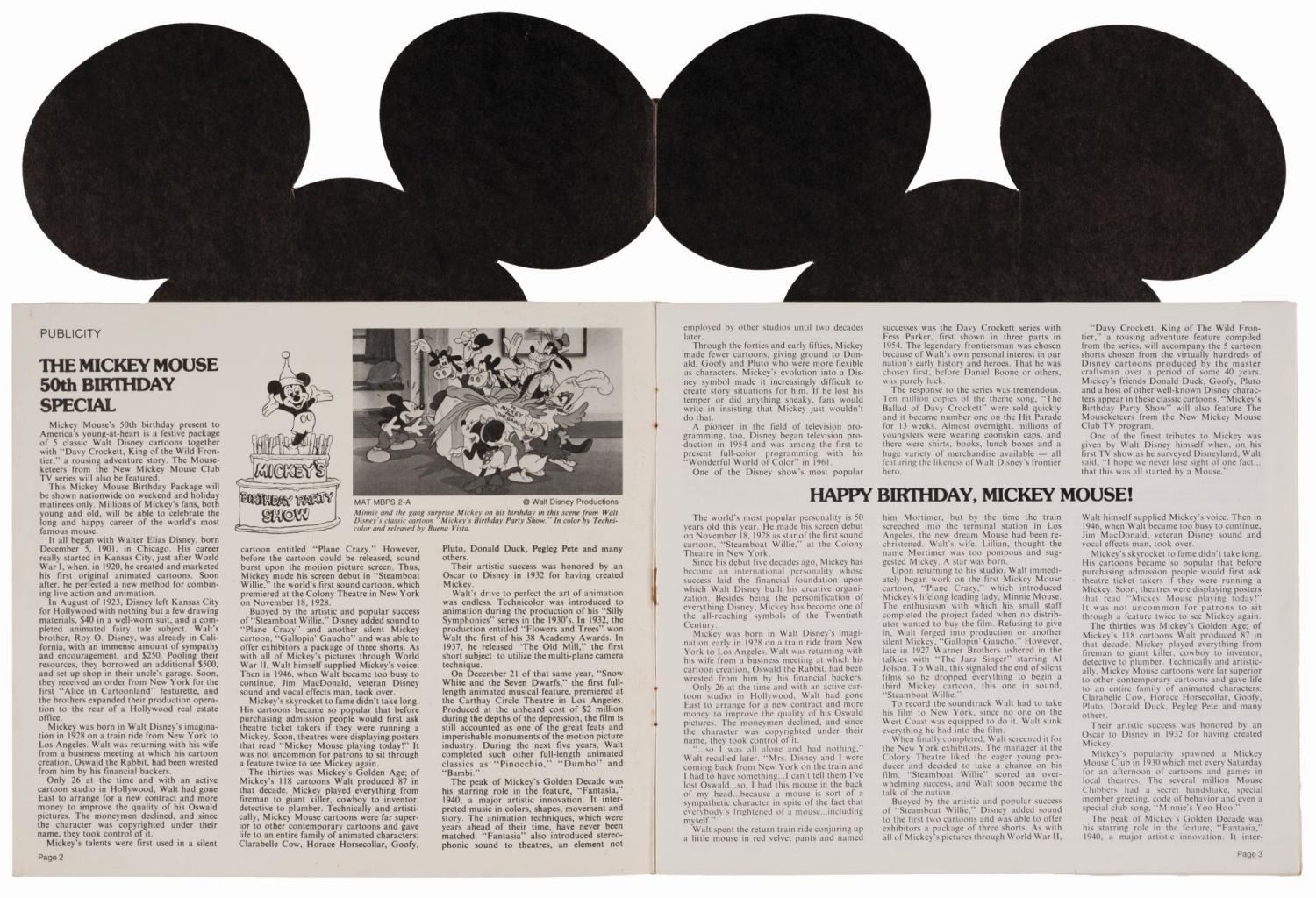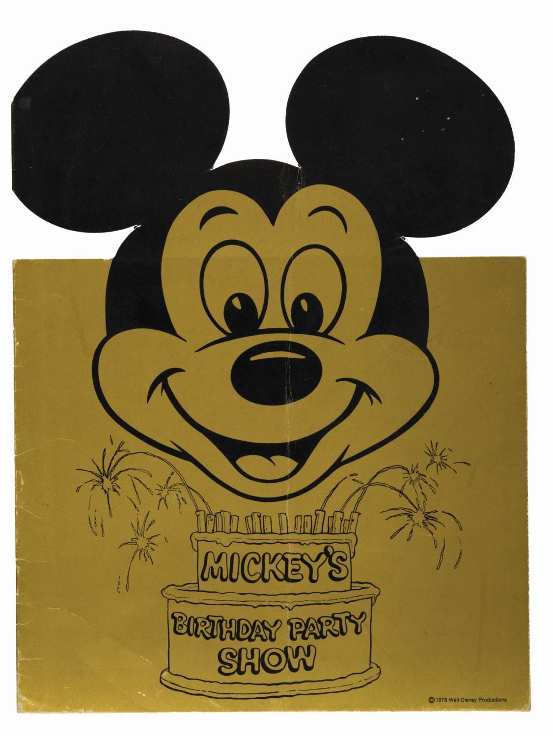 (Disney, 1978) A promotional booklet advertising Mickey's Birthday Party Show, the television special airing on November 15, 1978. The 15-pages cover audiences and sponsors, outlining TV spots, the theatrical trailer, licensed merchandise, and retail chain promotions. Measuring 12" x 9", the booklet is in good condition, with a faint vertical crease and scuffs to the cover.