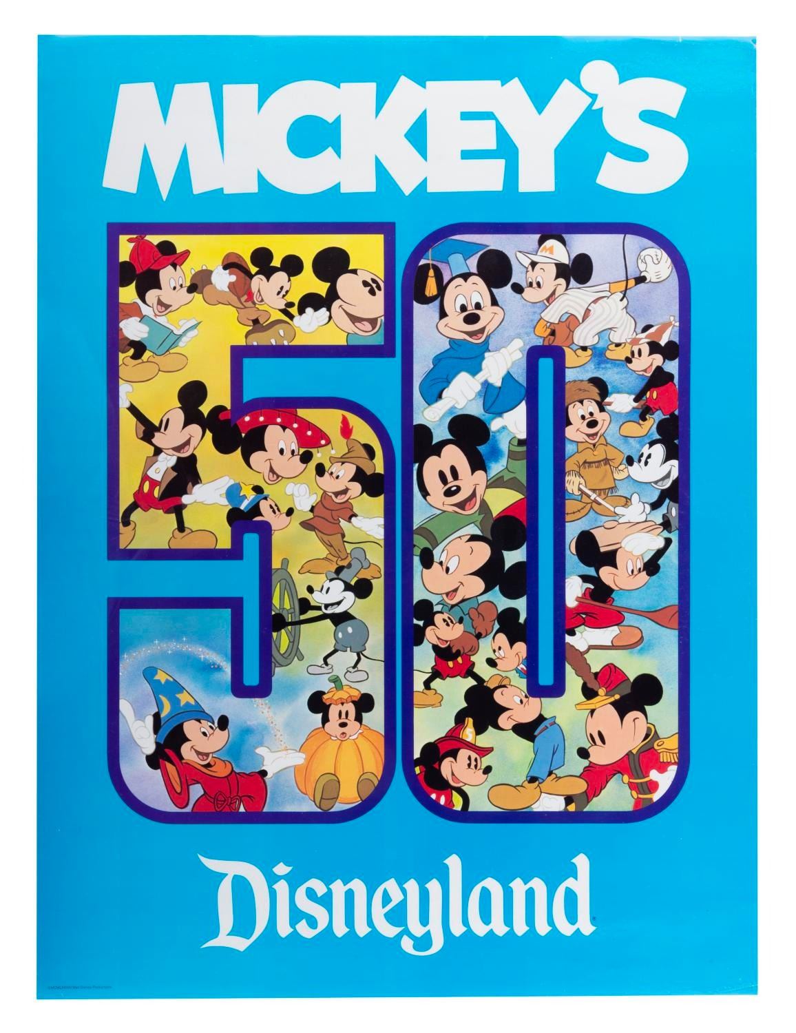 (Disneyland, 1978) A vibrant poster commemorating the 50th birthday of Mickey Mouse. Measuring 18" x 24", the poster is in very good condition with edge wear from use, creases in the corner, and very light tears. There is a 2" band of faint discoloration down the left edge.