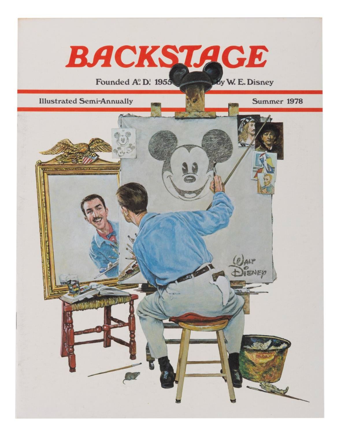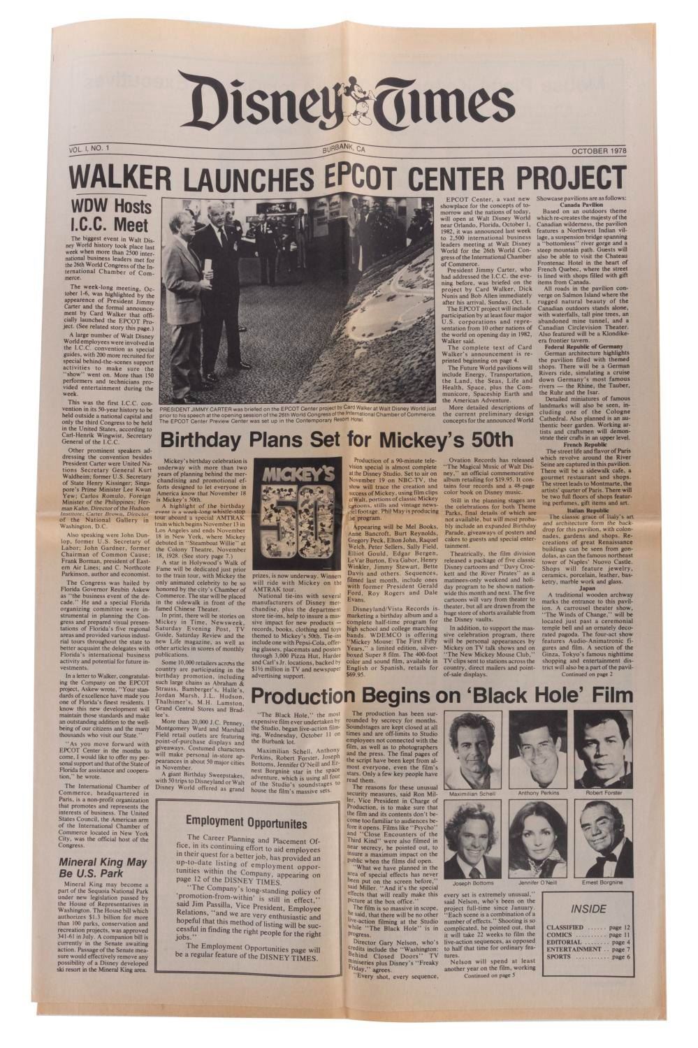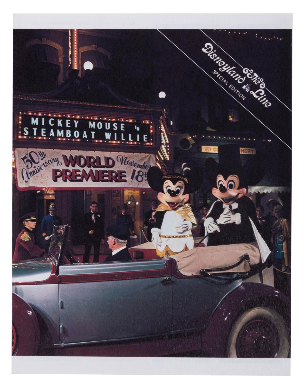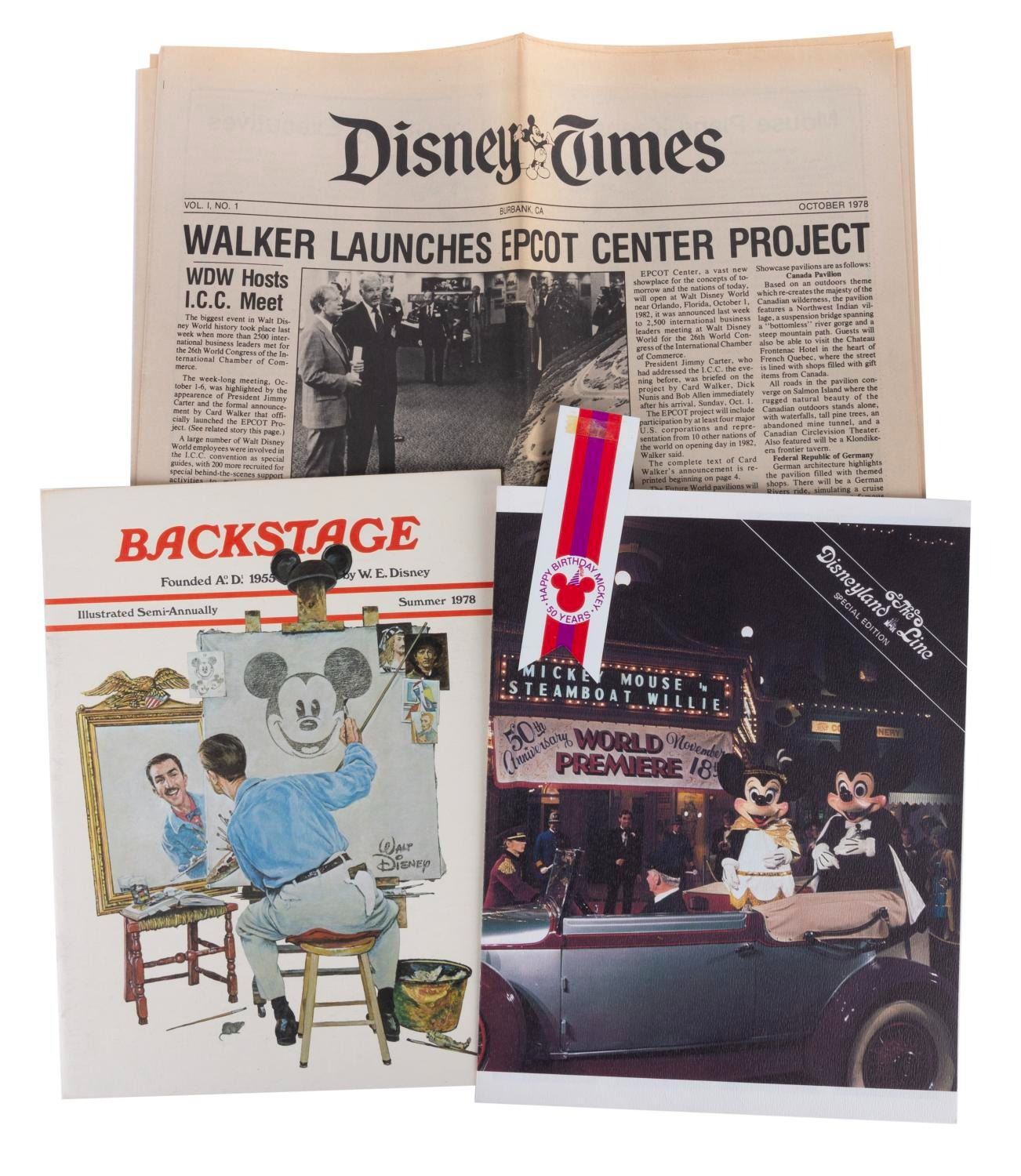 (Disneyland, 1978) A collection of items celebrating Mickey's 50th birthday including a Cast Member name badge paper ribbon, an issue of "Disneyland Line," a Summer 1978 "Backstage" magazine, and an October "Disney Times." Measuring from the 1.5" x 4.75" ribbon to the 14.5" x 23" newspaper, the items are in very good condition with light handling wear, adhesive residue along the top edge of the ribbon, and discoloration to the newspaper from age.